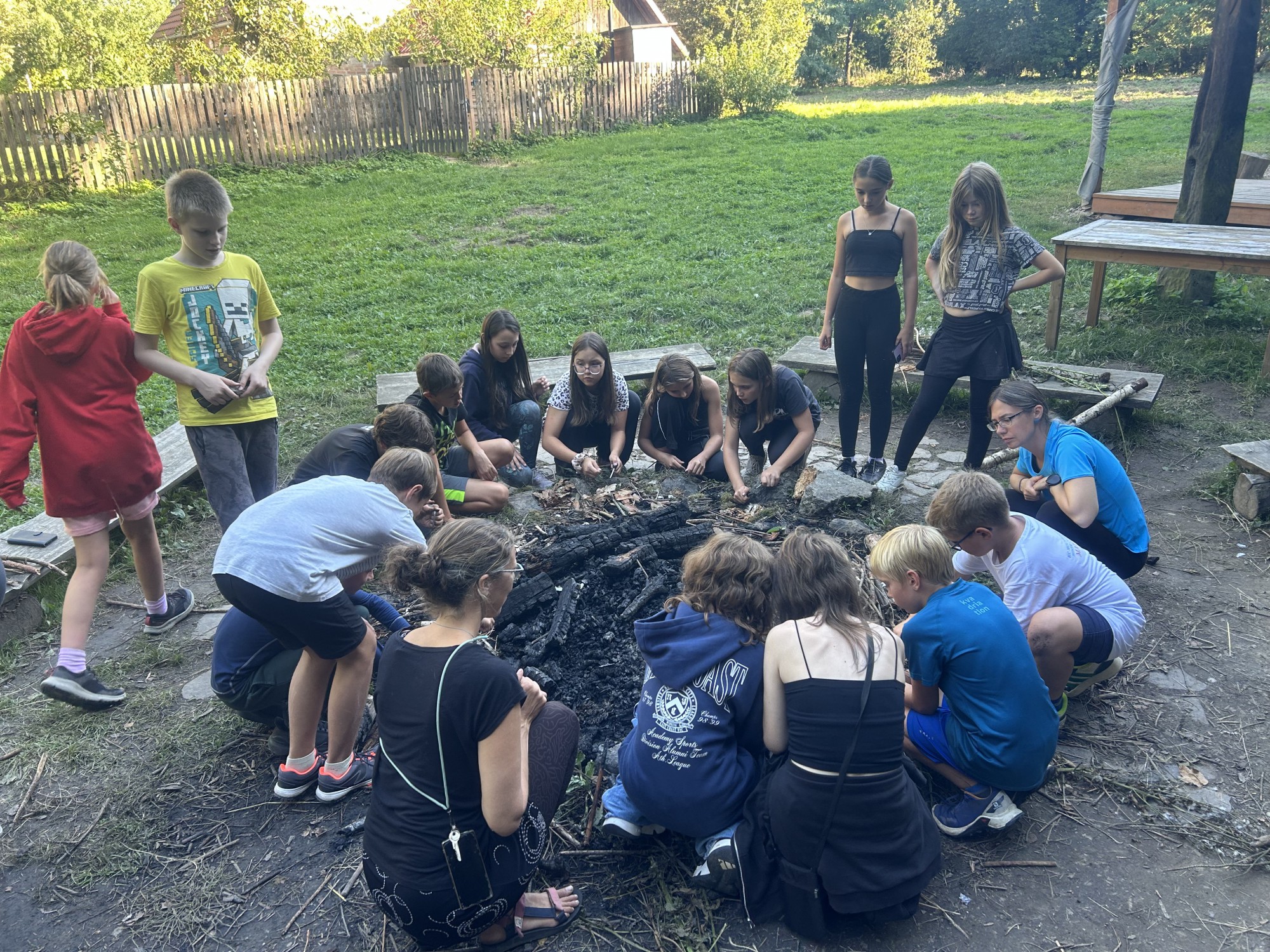 A jak se nám v hájence vedlo? Všichni máme spoustu nových zážitků i zkušeností – například jsme stavěli přístřešek z přírodnin tak, aby voda z kýble nenamočila spolužáky v něm schované, chystali troud a vykřesali oheň, filtrovali vodu z potoka a spoustu dalšího.