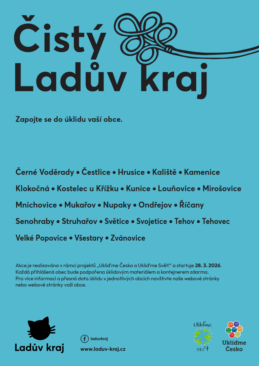 Jako každý rok i letos pořádáme za podpory národních iniciativ Ukliďme Česko a Ukliďme svět výzvu Čistý Ladův kraj. Tyto organizace nám poskytují úklidový materiál a naše společenství zároveň zajišťuje pro členské obce svozové kontejnery na sesbíraný odpad. Rádi bychom vás tímto pozvali k účasti na této společné akci.
