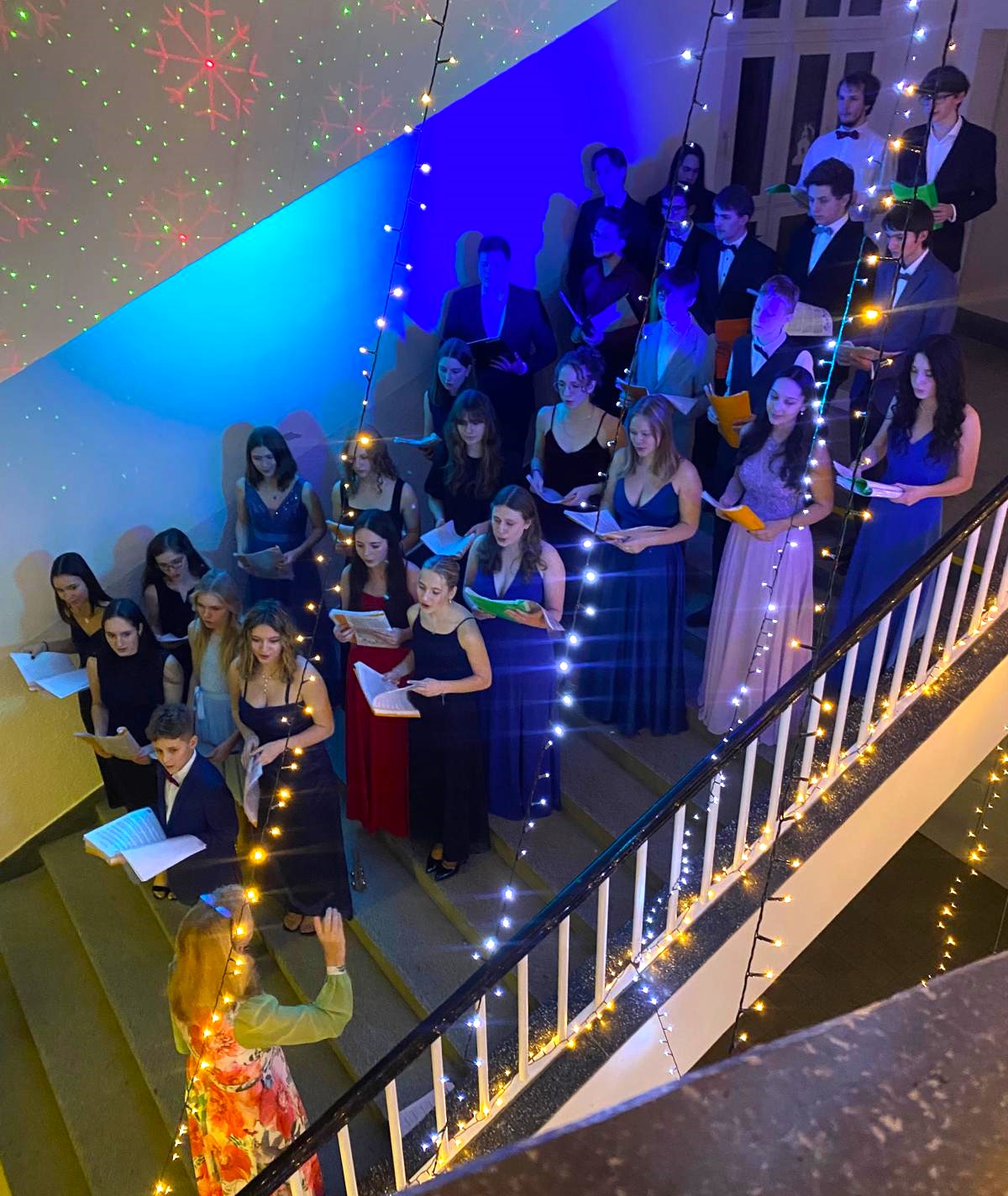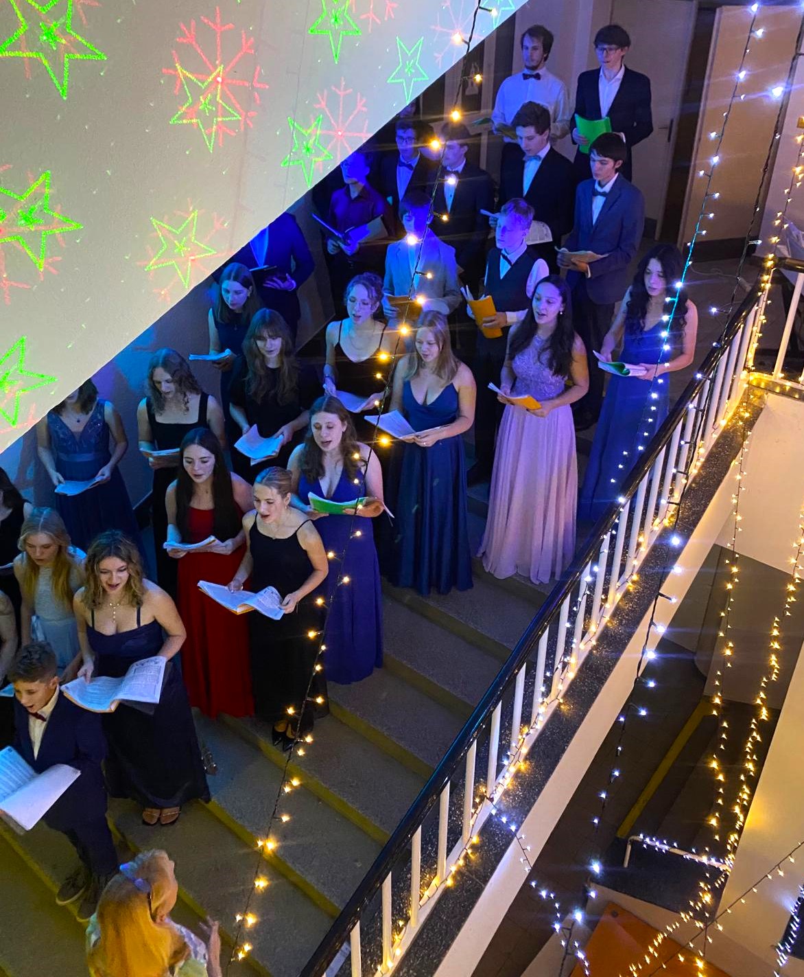 Ve středu 11. prosince se v prostorách školy konal tradiční Vánoční koncert na schodech. Schodiště sice potemnělo, ale hlasy našich sboristů rozsvítily spoustu malých světýlek v srdcích i duších všech, kteří se letos přišli podívat. Pod vedením bývalé kolegyně Ivany Remkové vystoupili zpěváci od primy až po maturitní ročníky a všem nám nadělili první vánoční dárek.