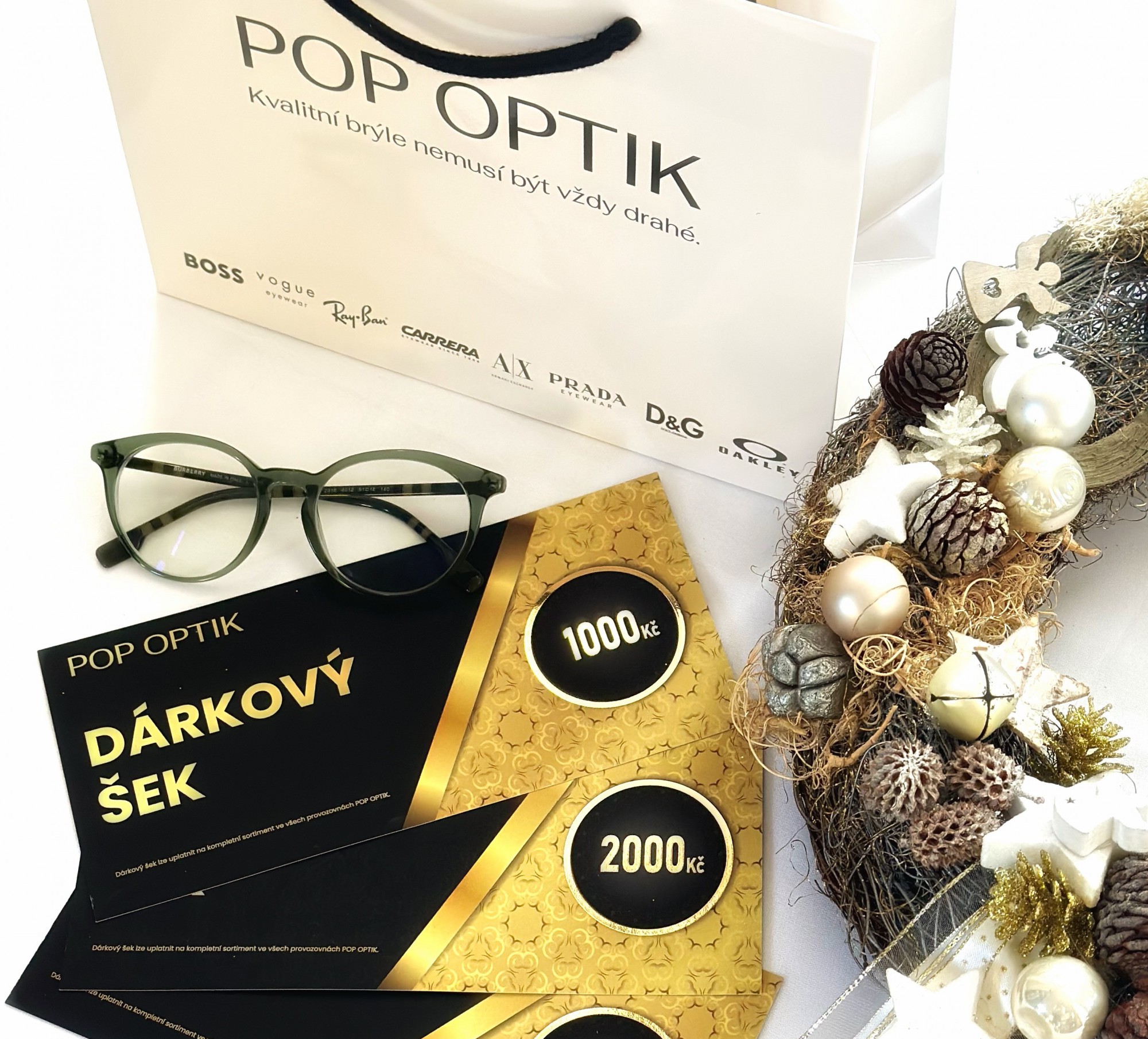 V případě, že víte o někom, kdo by ocenil nové brýle, zásobu kontaktních čoček nebo stylové sluneční brýle, můžete ho potěšit dárkovou poukázkou POP OPTIK. Poukázky nabízíme v hodnotách 1 000 Kč, 2 000 Kč a 5 000 Kč. Každá z nich je připravena v elegantní dárkové obálce, kterou stačí už jen vložit pod stromeček. K poukázce můžete přidat i drobný dárek – například čisticí sadu na brýle nebo řetízek italské značky COTI, které najdete i na našem webu www.popoptik.cz.