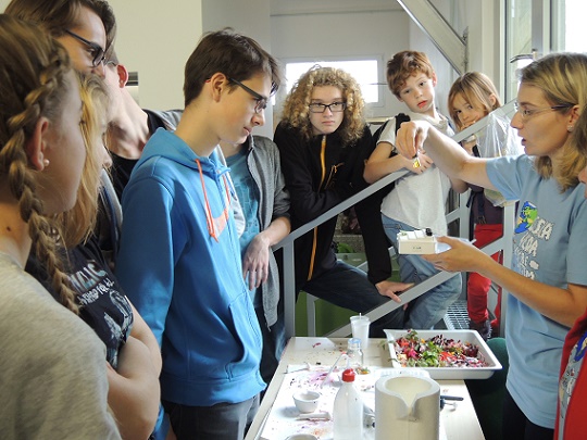 V budově se studenti rozdělili na dvě skupiny, ve kterých se poté vydali na prohlídku areálu. Čekala na ně spousta stánků se zajímavými informacemi z oblasti experimentální botaniky, interaktivními kvízy a zábavné aktivity. Zkusili jsme si izolovat DNA nebo vyrobit přírodní barvivo, seznámili jsme se s pojmy jako agar nebo fluorescence a vyzkoušeli si práci s pipetou a centrifugami. Také jsme měli možnost podívat se do skleníku, kde se pěstují rostliny určené k experimentování.