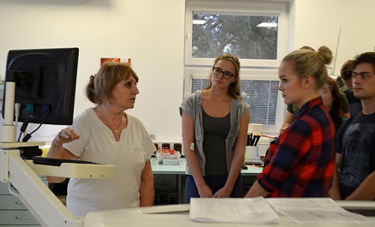 Ve středu 18.10.2017 jsme se v rámci semináře Člověk a zdraví vydali na exkurzi do biochemické laboratoře Nemocnice Říčany, kde se nás ochotně ujala vrchní laborantka paní Marcela Hrdličková. Nejprve jsme si nechali odebrat krev, ze které nám později zjišťovali krevní skupiny. Všichni tento "zásah do krve" zvládli velmi statečně, a tak zbyl prostor i pro pár fotografií. Následně jsme se odebrali do biochemické laboratoře nemocnice. Nejdříve jsme si prohlédli ledničky na skladování chemikálií a samotné krve. Posléze nám laborantky představily všechny přístroje, pomocí kterých v současnosti zkoumají krev a bez kterých dříve musely všechno zjišťovat "ručně". Pro nás všechny nejzajímavější částí prohlídky byl přístroj, který dokáže odhalit závažné nemoci, jako je například žloutenka a nebo AIDS.