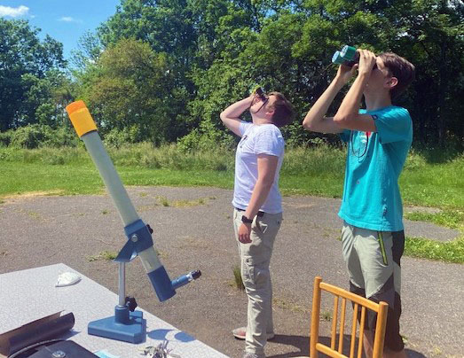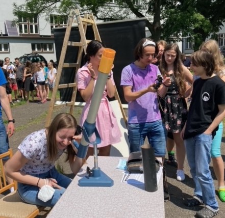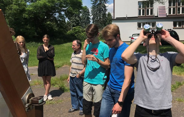 10. června proběhlo v České republice částečné zatmění Slunce. Vesmírné divadlo mělo probíhat mezi 11:42 - 13:35. Panovala obava, že sluneční kotouč bude zakryt oblačností nebo přijde déšť a z pozorování sejde. Dalekohledy byly vyneseny na školní pozemek a připraveny částí studentů septimy v součinnosti s učiteli fyziky a výtvarné výchovy k pozorování. Obraz Slunce byl přes soustavu zrcadel dalekohledu a vhodně zvolený objektiv promítnut na plátno zavěšené na štaflích zapůjčených panem školníkem. K dispozici všem příchozím byly též brýle, dva triedry a čočkový dalekohled, vše vybavené speciálními filtry pro přímý pohled na Slunce.