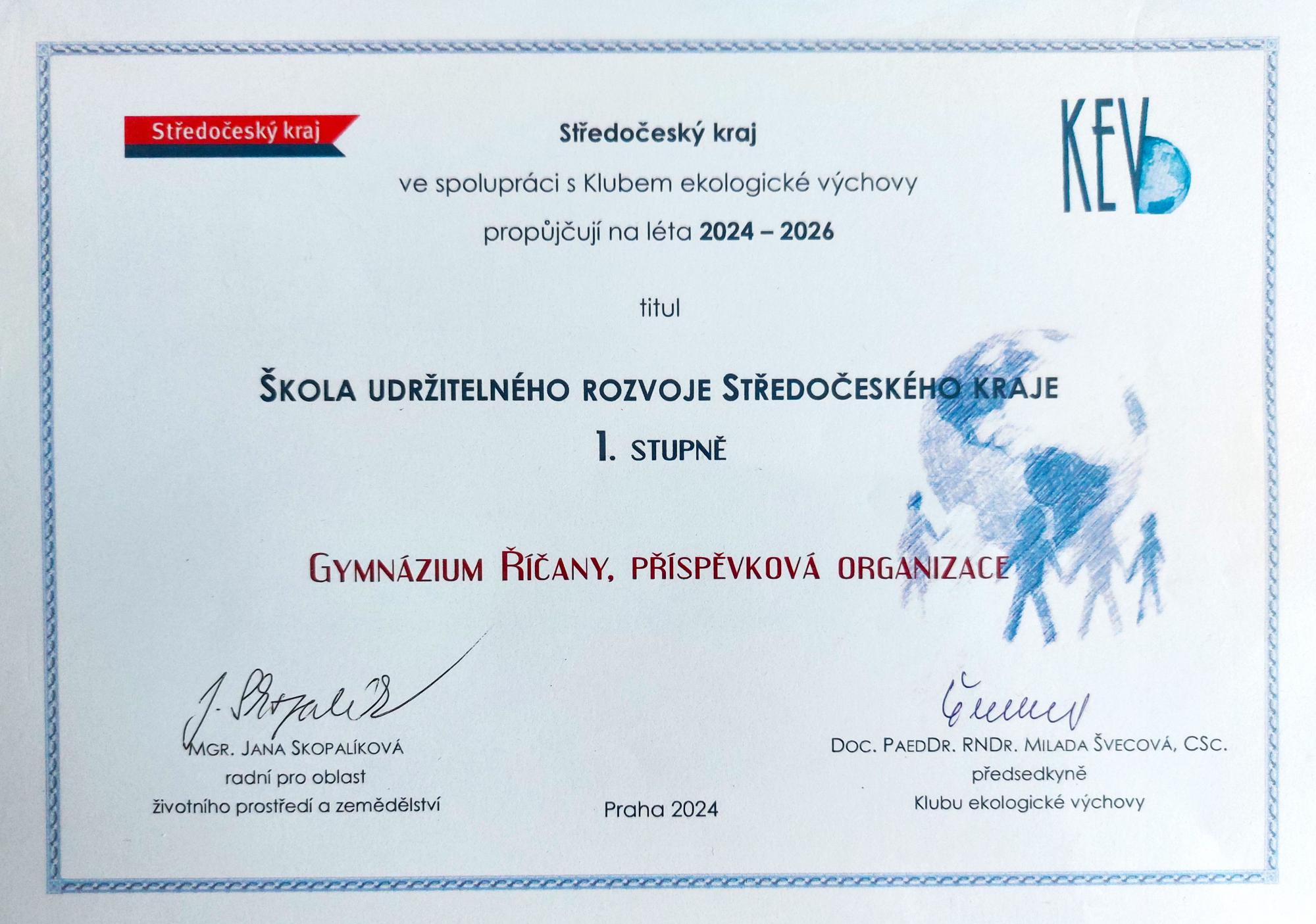 V posledním březnovém týdnu jsme převzali na Krajském úřadě Středočeského kraje z rukou doc. PaedDr. RNDr. M. Švecové, CSc., předsedkyně Klubu ekologické výchovy certifikát Škola udržitelného rozvoje Středočeského kraje 1. stupně. Jsme rádi, že jsme titul opět obhájili a můžeme jej užívat do roku 2026.