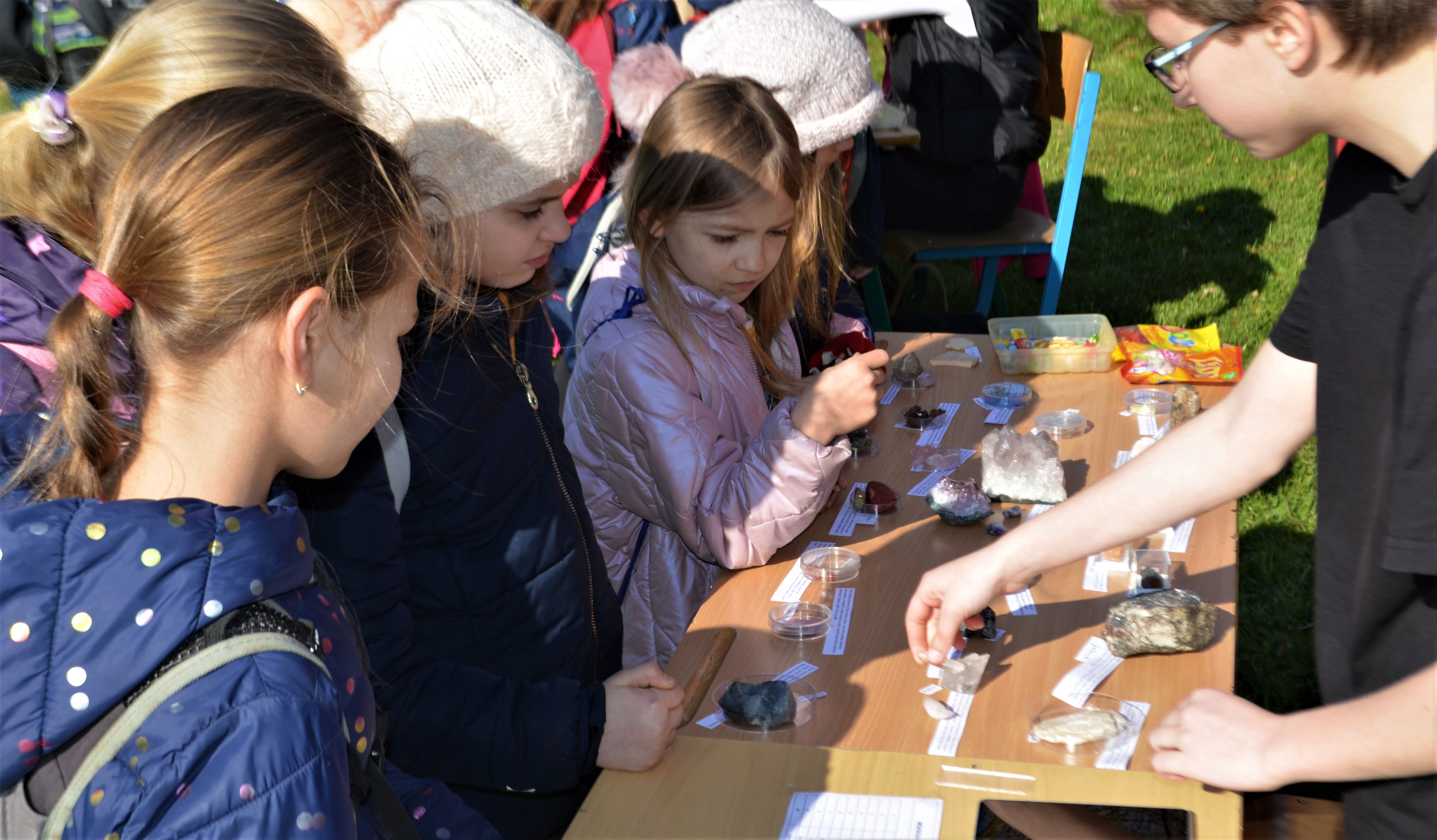 Ve středu 3. května se žáci kvarty vydali na exkurzi do říčanského Geoparku. Zde jsme se zúčastnily environmentálního programu Pestrý svět minerálů a hornin. Na místě jsme byli přivítáni RNDr. J. Švandovou, která nás seznámila s plánem akce. Byli jsme rozděleni na týmy, jež se musely pokusit najít v geoparku určitou horninu a správně ji zařadit do systému hornin. Navštívili jsme laboratoř, kde jsme se například dověděli, jak se určuje složení hornin, v polarizačním mikroskopu jsme si prohlédli tenké výbrusy hornin, které pomáhají v určování jejich složení, a byl nám předveden rychlý růst krystalů. Další úkol na nás čekal v jeskyni, kde jsme měli najít krabici s nerosty, které jsme poté na základě stanovení jejich fyzikálních a chemických vlastností měli určit. V závěru programu týmy prezentovaly svoje výsledky ostatním skupinám a dověděli jsme se správná řešení.