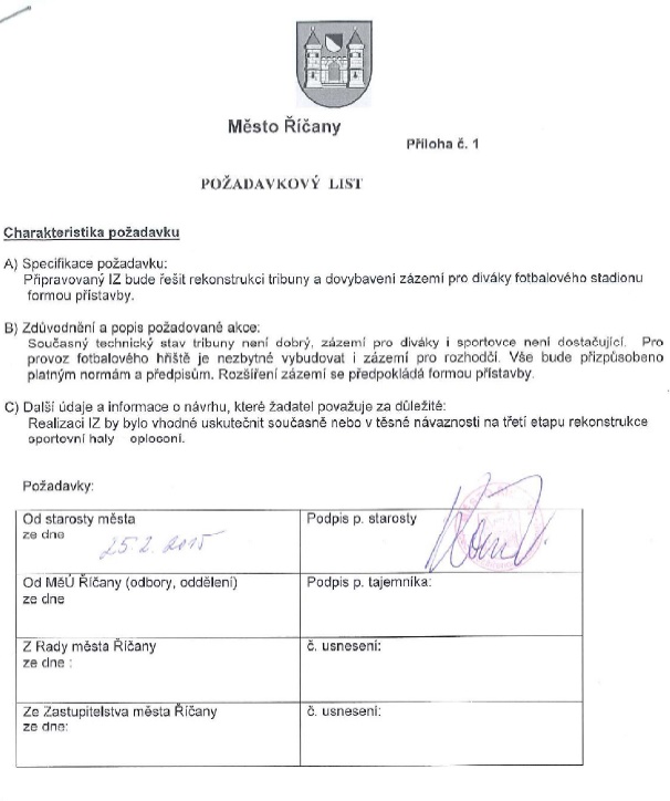 Investice se dostala do seznamu projektů a v roce 2015 jsem podepsal požadavkový list na zpracování investičního záměru (viz požadavkový list záměru).