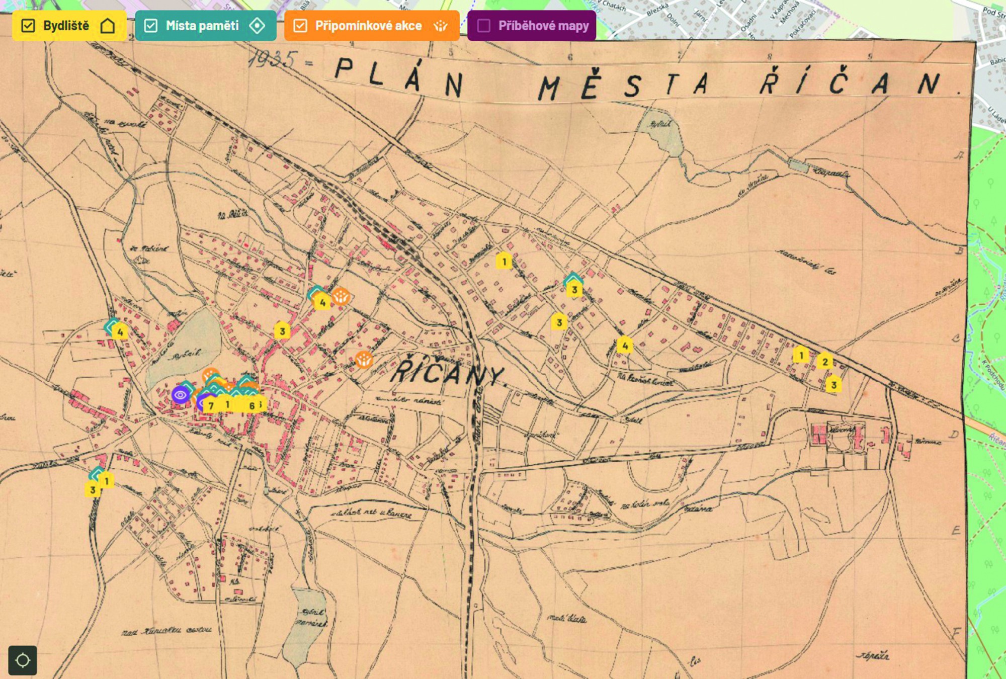 Říčany jsou po Praze a Pacově (na Vysočině) dalším městem, které si tímto způsobem uchovává památku na své zavražděné obyvatele. MemoMapu jsme vytvářeli během loňského roku ve spolupráci města s Masarykovým ústavem a Archivem AV ČR, Muzeem Říčany, 2. ZŠ Bezručova a 3. ZŠ u Říčanského lesa. Mapa obsahuje výsledky všech našich dosavadních bádání o osudech říčanských Židů z období protektorátu, a to od roku 2012, kdy se muzeum a město této tematice systematicky věnují. Záznamy z akcí k uctění památky obětí holocaustu a ukládání Stolpersteinů doplnily nejnovější informace o dvou říčanských Tórách a modlitebnách, ve kterých byly používány. Obsah mapy je rozdělen do několika vrstev, které přiblíží bydliště židovských obyvatel Říčan, místa paměti, pietní akty, a to na historické mapě Říčan z roku 1935. Specifickým typem dat, který nelze úplně zahrnout pod vrstvy, je příběhová mapa znázorňující putování dvou říčanských Tór.
