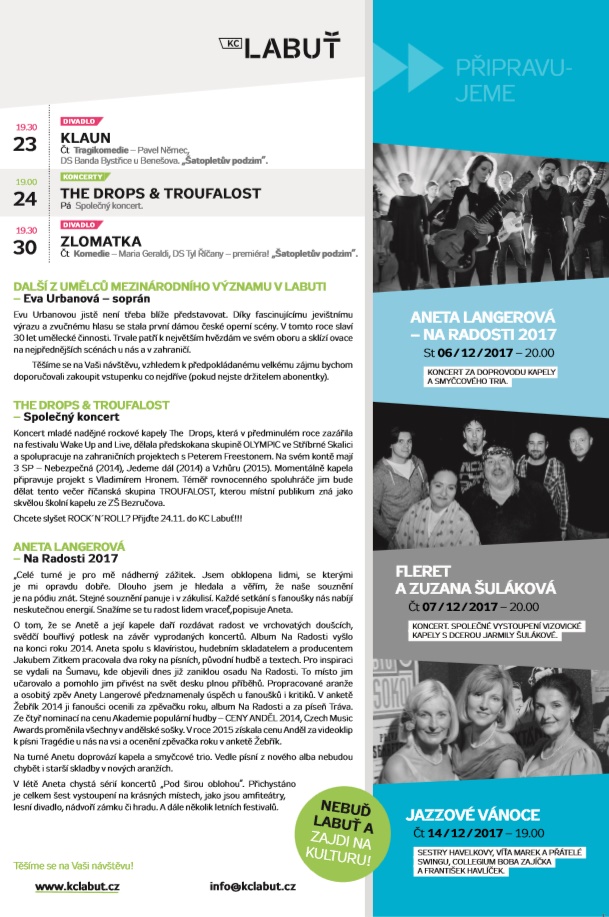 Kalendář akcí na listopad 2017, Pozvánka na Koncert Anety Langerové, Advent 2017