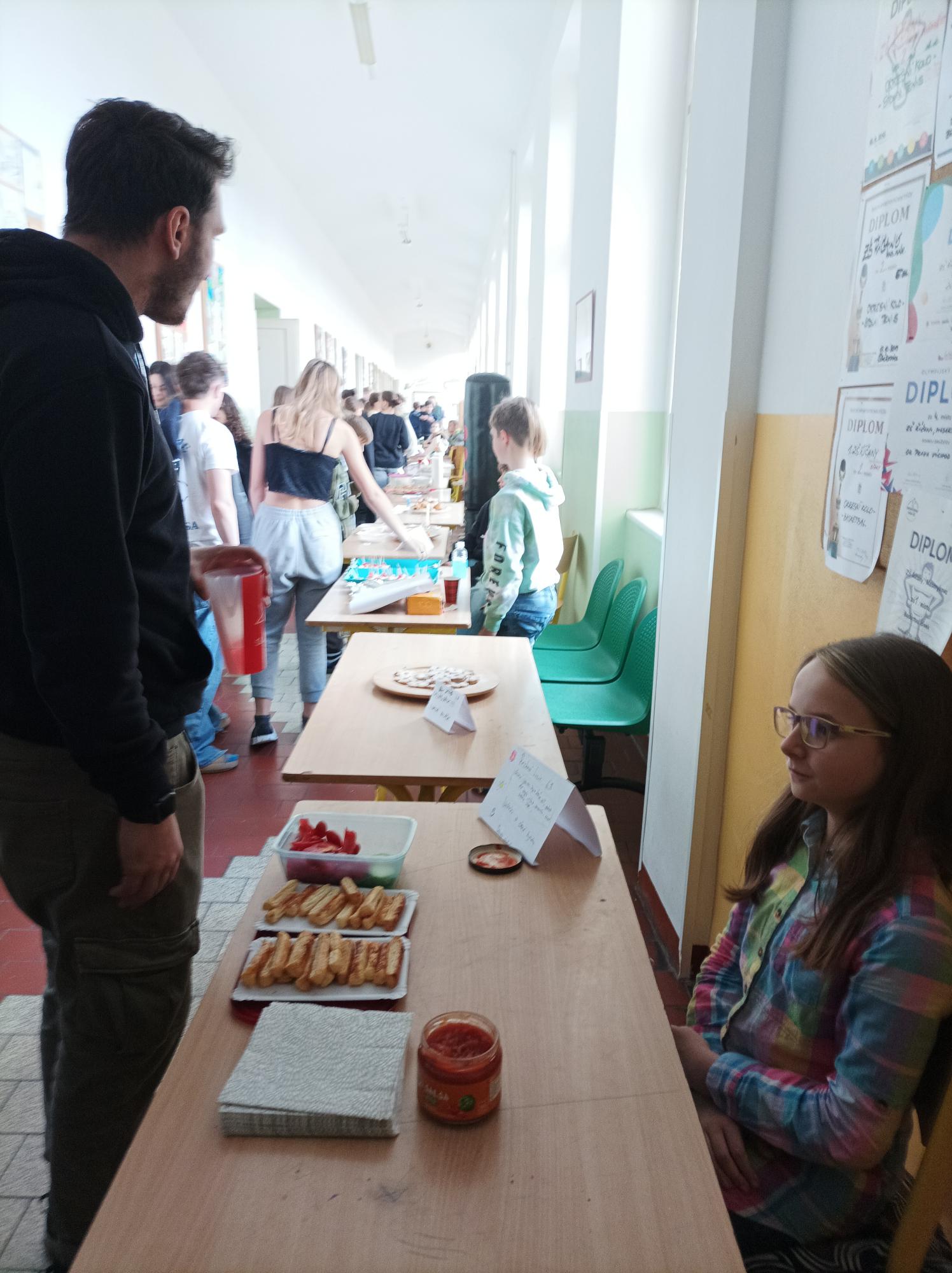 V pondělí 22. dubna proběhl v hlavní budově naší školy tradiční kulinářský den. Děti v neděli napekly a navařily, v pondělí během druhé hodiny své výrobky nazdobily a vyrovnaly je na lavice umístěné na chodbách školy. Ty se tak změnily v jedno ohromné lahůdkářství. Před koncem druhé hodiny a během hlavní přestávky chodili amatérští kuchaři, členové školního parlamentu a také učitelé ochutnávat a hodnotit práci jednotlivých šéfkuchařů. Na své si přišli milovníci sladkých i slaných pokrmů a nápojů. Některé zákusky by se daly zařadit mezi umělecká díla. Za tolik vynalézavosti a množství různých kombinací při čarování s pomazánkami by se nemusel stydět ani Zdeněk Pohlreich. Ani milovníci tradičních pokrmů nepřišli zkrátka, i když v pravidlech našeho dne je dáno, že všechna jídla musejí spadat do studené kuchyně. Bramborový salát a řízečky zmizely během chvíle.