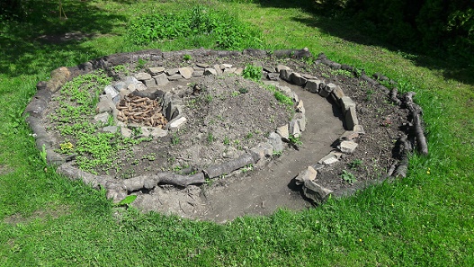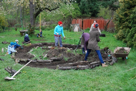 Spirála - záhon na zahradě bílého domu je již téměř hotová, osetá semínky i sazeničkami. Zbývá dotvořit cestičku ze šišek a kamínků, kterou udělají děti. Postupně sbírají šišky, klacíky a kamínky. Jedná se o vyvýšený záhon pro smíšenou výsadbu bylinek a zeleniny. Velké díky Aleně Kopřiva Chadové za vedení a pomoc s realizací, díky ženám z lesního dopoledne za příjemný čas při společné práci. Dílo se opravdu vydařilo.