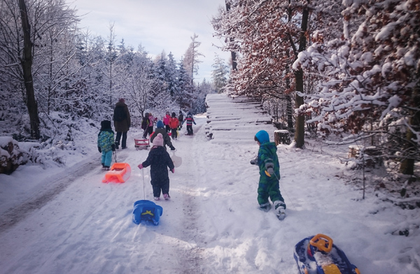 Po zimním slunovratu k nám přišla zima. Děti v lesní školce tráví venku denně 70–90 % času. Denně nachodí i několik kilometrů za různého počasí. Potýkají se se zimou, vlhkem, mrazem, větrem. Dá se říct, že zima je velké téma. Optikou dětí, pro které je v předškolním věku základní potřebou pohyb, které žijí tady a teď a od dospělých se učí nápodobou: mimo jiné se o sebe postarat, odhadnout své možnosti a sílu, vnímat své vlastní tělo, vyměnit si mokré oblečení anebo požádat o pomoc s jeho výměnou... Na zimu se jednoznačně těší. Děti neřeší, jaké je roční období. Ideální je, když je zima bílá, se sněhem a mrazem. Když mrzne, vyrábějí se totiž ledové kostky na hraní, které se mohou i obarvit, nebo ledové ozdoby, bublifukové bubliny, které při teplotách pod nulou mrznou. Do sněhu se dá kreslit. Do jinovatky psát.