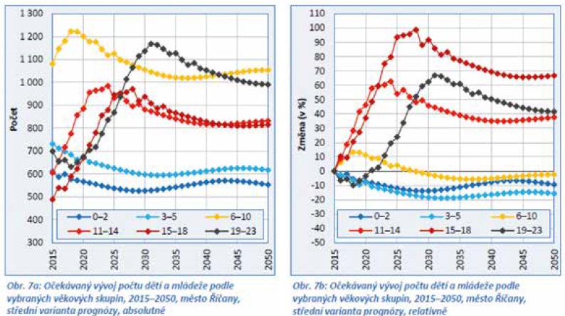 V první polovině mezi lety 2015 a 2050 počet dětí ve věku 3–5 let s největší pravděpodobností nejprve poklesne a následně se stabilizuje na úrovni zhruba o 20 % nižší než v současnosti. Analogicky k očekávanému vývoji počtu dětí v předškolním věku poroste počet dětí ve skupině 6–10 let, která ve velké míře určuje počet dětí na prvním stupni základních škol. Jejich počet by měl růst ještě několik málo let a před koncem této dekády dosáhnout maxima. Před rokem 2030 by se však měl vrátit na výchozí úroveň a poté se víceméně stabilizovat na počtu asi o 5 % nižším, než byl počet výchozí. V absolutním vyjádření by se mělo jednat o relativně plynulé změny v rozmezí 1 000 až 1 200 dětí. Vlivem očekávaného výrazného nárůstu počtu dětí ve věku docházky na druhý stupeň základních škol (11‒14 dokončených let věku) se celkový počet dětí ve školním věku ve městě Říčany v porovnání s výchozím stavem podstatně zvýší. „Jestliže ke konci roku 2015 žilo podle údajů ČSÚ na území města méně než 1 700 dětí ve věku povinné školní docházky, potom v letech 2021–2022 by jejich počet měl kulminovat na hladině asi o 450 dětí vyšší. Dětí v této skupině by mělo být absolutně nejvíce v rozmezí let 2021 až 2024, a to téměř 1 000, což by ve srovnání s výchozím stavem (605 dětí) znamenalo počet vyšší zhruba o 60 %,“ upřesňuje Tomáš Kučera. Přestože po roce 2024 počet dětí ve věku 11‒14 dokončených let pravděpodobně výrazněji poklesne, jejich počet po celé období prognózy bude nejméně o třetinu vyšší než na konci roku 2015. Počet všech školou povinných dětí by se tak ve druhé polovině období prognózy měl stabilizovat někde v rozmezí hodnot 1 800 až 1 900 dětí, tedy na hladině vyšší zhruba o deset procent ve srovnání se současným stavem (obr. 7 a–b). Stejné změny zaznamenáme i na druhém konci věkové pyramidy. Již sám vzestup celkového počtu seniorů, tedy osob ve věku 65 let a vyšším, bude dynamický. V horizontu prognózy bychom měli být svědky jeho zdvojnásobení.