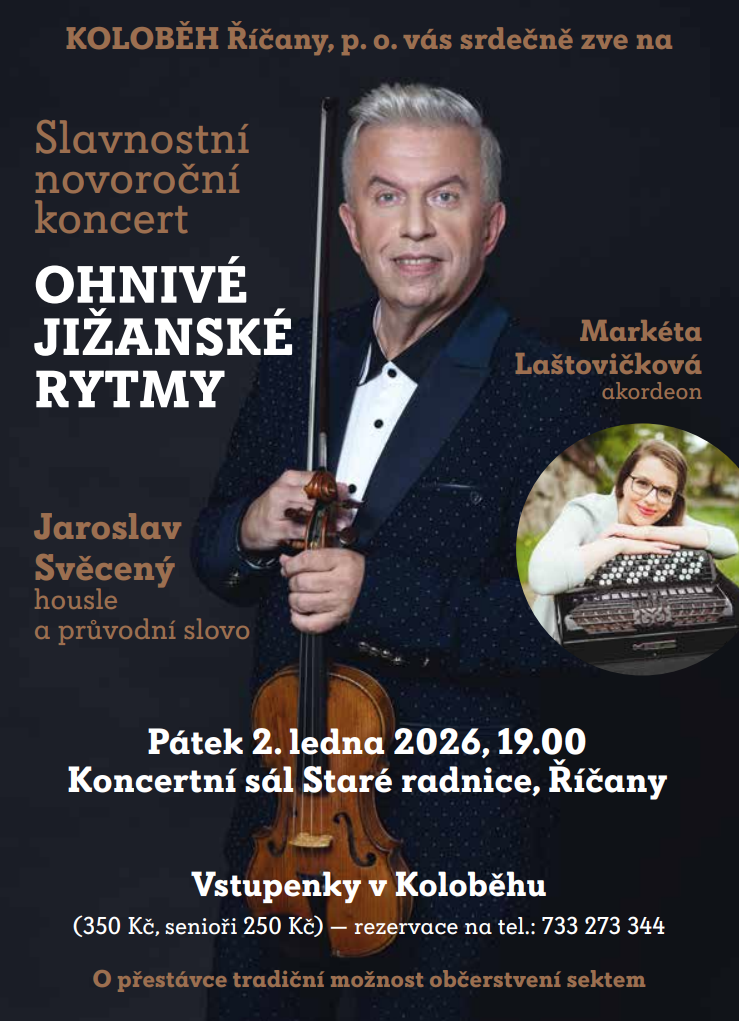 Díky mému dlouholetému přátelství s houslovým virtuosem Jaroslavem Svěceným se podařilo domluvit jeho koncert přímo v našem městě. Brilantní přednes tohoto výjimečného sólisty si budete moci vychutnat v pátek 2. ledna 2026 od 19 hodin v historickém sále Staré radnice. Koncert je pořádán ve spolupráci s Koloběhem. Je skvělé, že si takovýto umělecký zážitek můžeme dopřát bez nutnosti cestovat do Prahy. V minulých letech se mi podobně podařilo propojit Koloběh například s Andreou Kalivodovou nebo manžely Zorou a Zdeňkem Mertovými. Věřím, že i tentokrát se říčanské publikum má na co těšit.