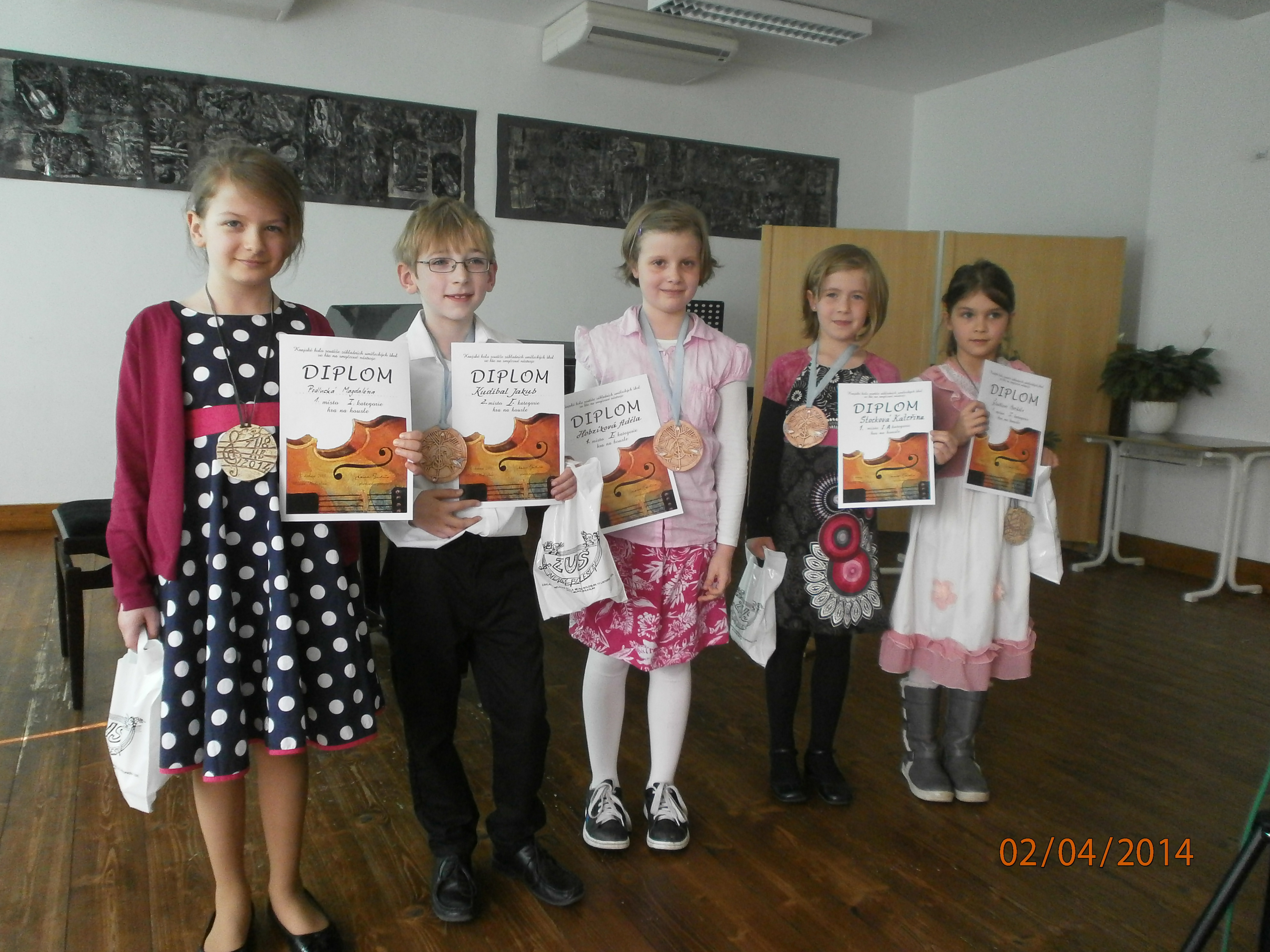 Další velký úspěch zaznamenali naši houslisté ve smyčcové soutěži v Mladé Boleslavi. V oboru hra na violoncello získala Terezie Mužíková 3. místo a Kateřina Podlucká 1. místo (ped. O. Cibulka). V houslové soutěži jsme obsadili tři druhá místa - Jakub Kudibal, Cyril Šimon, Jáchym Šimon (ped. H. Kutmanová) a šest. 1. míst, z toho čtyři nadějné houslistky postupují do ústředního kola!! 1. místo získala Markéta Štochlová (ped. J. Adamusová) a Magdaléna Kořenová (ped. H. Kutmanová). Do ústředního kola postupují Kateřina Stocková a Adéla Hobzíková (ped. H. Kutmanová) a Magdaléna Podlucká a Kateřina Končická (ped. J. Adamusová).