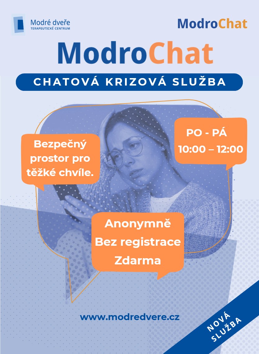 Terapeutické centrum Modré dveře spustilo novou službu ModroChat, která nabízí lidem možnost sdílet své starosti a emoce s odborníkem v reálném čase prostřednictvím online chatu. Služba je určena každému, kdo se ocitl v náročné životní situaci, cítí se pod tlakem nebo si neví rady a potřebuje podporu či nasměrování.