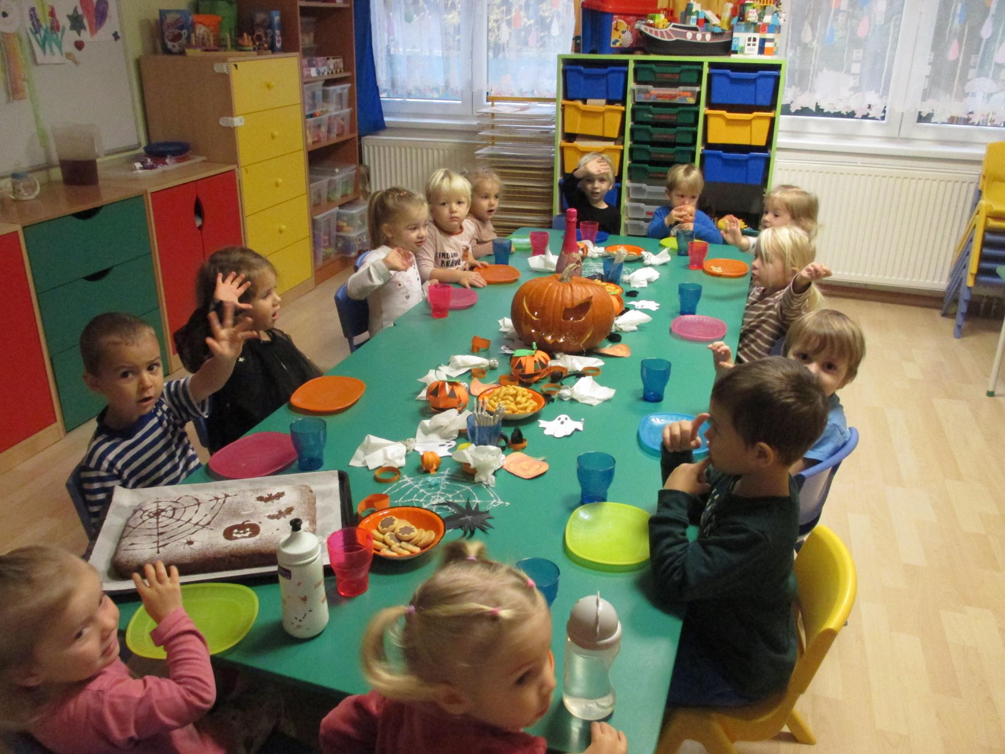 Podzimní čas se pomalu krátí a ve školce se budeme chystat na zimu. Společně jsme vytvořili mnoho výrobků z přírodnin a užili si halloweenský týden, spojený s dlabáním dýní a oslavou Halloweenu. Venku za krásného počasí jsme pozorovali přírodu, která nám ukázala svoji podzimní paletu teplých barev. Učíme se nové a nové básničky, písničky, tanečky, provozujeme spoustu pohybových aktivit, které opravdu děti baví.