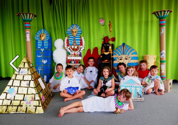 Nejdříve jsme s dětmi načerpali informace z encyklopedií a knížek a hned jsme měli několik nápadů. Začali jsme zvířaty - velbloudem, egyptskou kočkou, a nechyběl ani skarabeus. Poté jsme přistoupili k Tutanchamonovi, mumii, obrazu sfingy, váze, sloupům a k dalším drobným předmětům, jako byly náhrdelníky, náramky apod. Naší největší výzvou byl Anubis na trůnu. Děti malovaly, vystřihovaly, lepily, stříhaly, kašírovaly a zdobily podle vlastní fantazie. Na závěr jsme uspořádali egyptský karneval a s výrobky se tak rozloučili, abychom je mohli osobně předat přímo v galerii v Lidicích, kde budou následně oceněné výrobky vystaveny. Některé poputují i do jiných států.