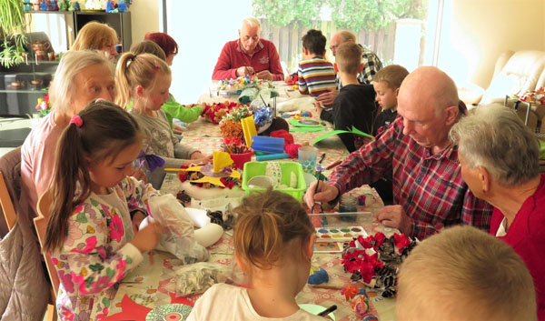 Máme tu konečně krásné počasí, všechno kvete, roste a i lidé se na sebe více usmívají. A tak si děti ze zelené třídy řekly, že by mohly udělat radost i babičkám a dědečkům, třeba ve Stacionáři Olga v Říčanech. Připravily si pro ně vypichování věnců z látek, zápichy do květináčů nebo zahrádky a malování na sádrové odlitky. Každý si mohl vybrat, co chtěl. Babičky i dědečkové byli milí a přátelští a děti byly nadšené, že mohly pomoci, poradit. Cítily se tak velmi důležitě. Stejně tak i senioři, kteří si výrobky navzájem předváděli. Věříme, že se společné tvoření babičkám a dědečkům líbilo a už se těšíme na další setkání.