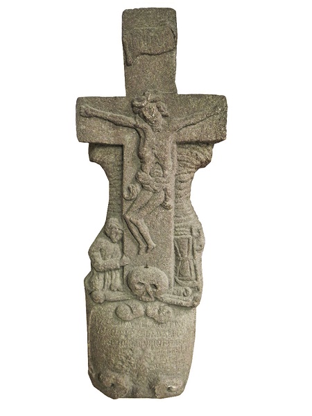 Pojednávaný náhrobek je v horní části otesán do tvaru kříže s tělem Krista. U paty kříže klečí modlící se postava (patrně je vyobrazena osoba, která na zhotovení náhrobku dala peníze). Uprostřed se nachází lebka s kostmi. Na druhé straně jsou pak vytesány přesýpací hodiny jako symbol plynoucího času.