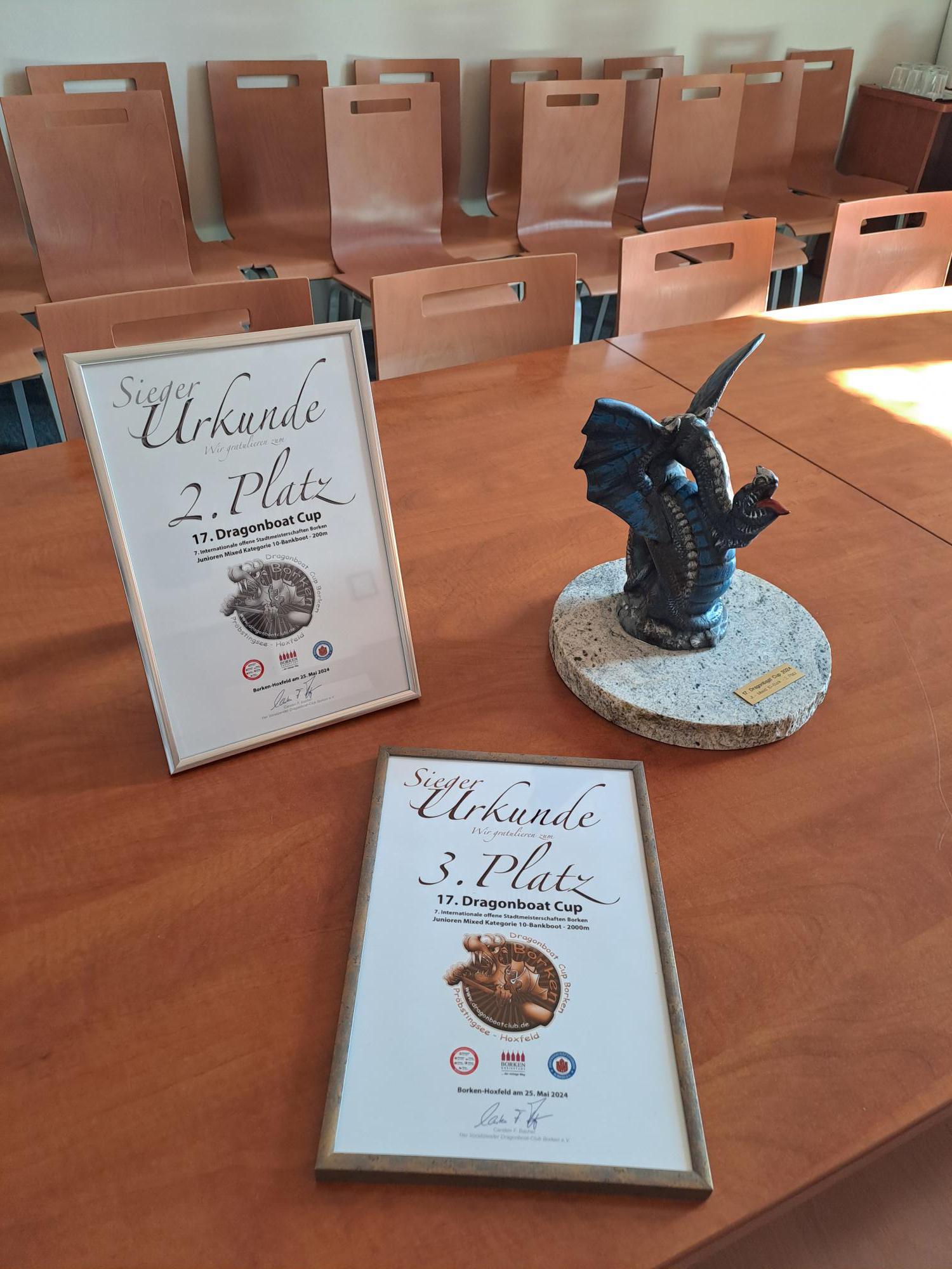 Ve čtvrtek 23. května se většina z nás vydala na třídenní výlet do německého Borkenu, kde jsme se účastnili závodů dračích lodí. Cesta byla hodně dlouhá. Po příjezdu jsme se ubytovali a čekal nás trénink. Někdo v takové lodi seděl poprvé, tak jsme se museli sehrát a ujasnit si strategii. Těšili jsme se pak na další den, kdy se konaly závody. Na vzdálenost 200 metrů jsme se umístili na druhém místě, 2000 metrů jsme zdolali třetí. Odměnou nám byl krásný pohár, se kterým jsme se vrátili domů.