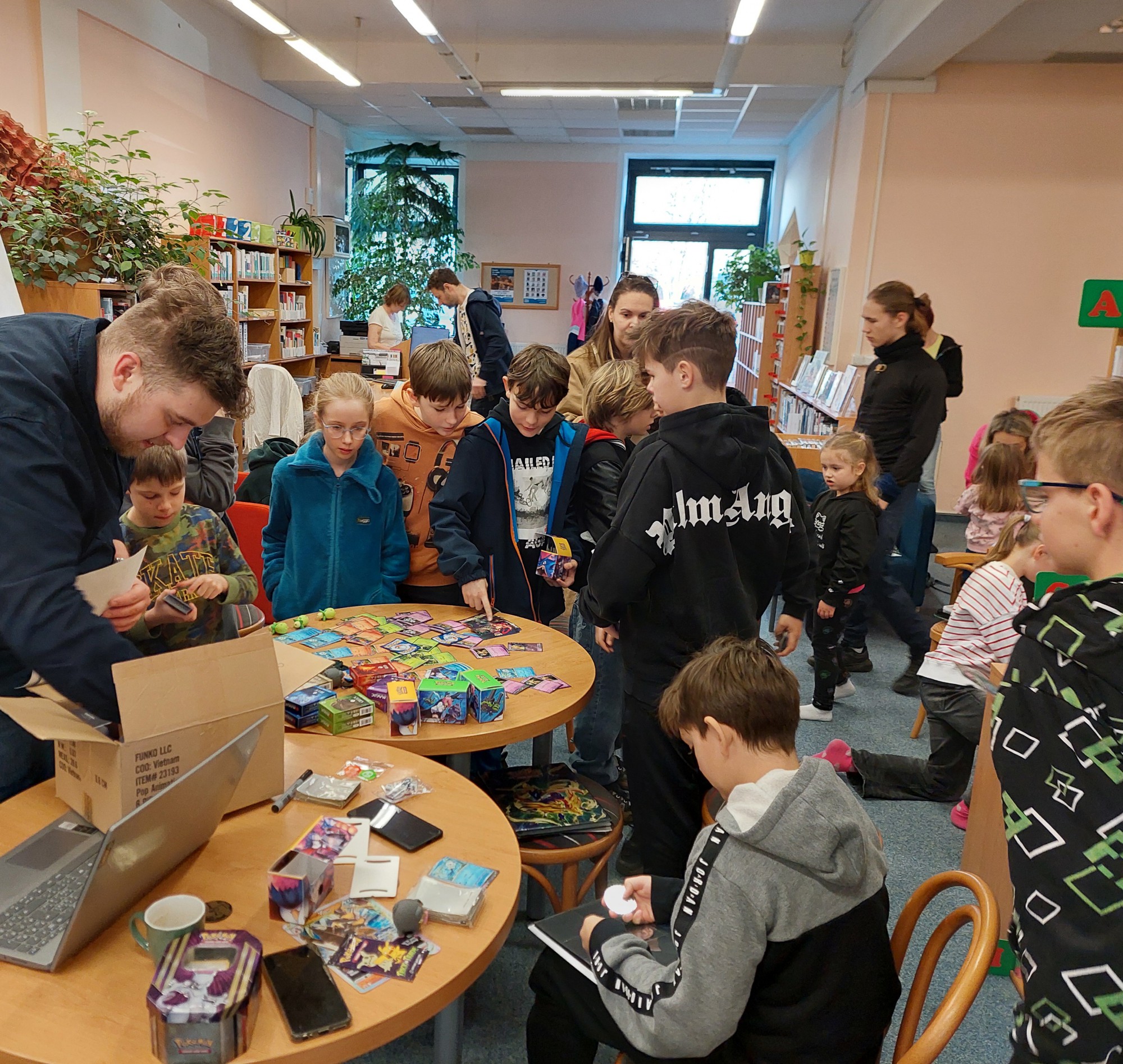 V sobotu 7. března to u nás v oddělení pro děti ožilo sběratelským nadšením, když se na Pokémon dni sešlo více než třicet kluků a holek. Pod trpělivým vedením Tondy Dynybila se děti i rodiče naučili, jak správně oceňovat své sbírky, osvojili si férová pravidla vyměňování a pronikli do tajů stavby herních balíčků. Tonda navíc účastníkům představil i populární hru Magic: The Gathering a její pravidla. Ochotně všem po celé dopoledne vysvětloval též pravidla karetní hry Pokémon. Na návštěvníky čekalo milé překvapení v podobě bohatého stolu plného kartiček, krabiček, plakátů a výukových balíčků, ze kterého si děti mohly vybrat něco pro radost. Knihovnou prostupovala kreativní atmosféra plná sdílení, zatímco se v hloučcích vesele obchodovalo a u stolů napínavě hrálo. Moc děkujeme všem, kteří dorazili a pomohli tuto skvělou náladu vytvořit. Už teď se na vás těšíme při dalším Pokémon dni, který pro vás plánujeme na 18. dubna!