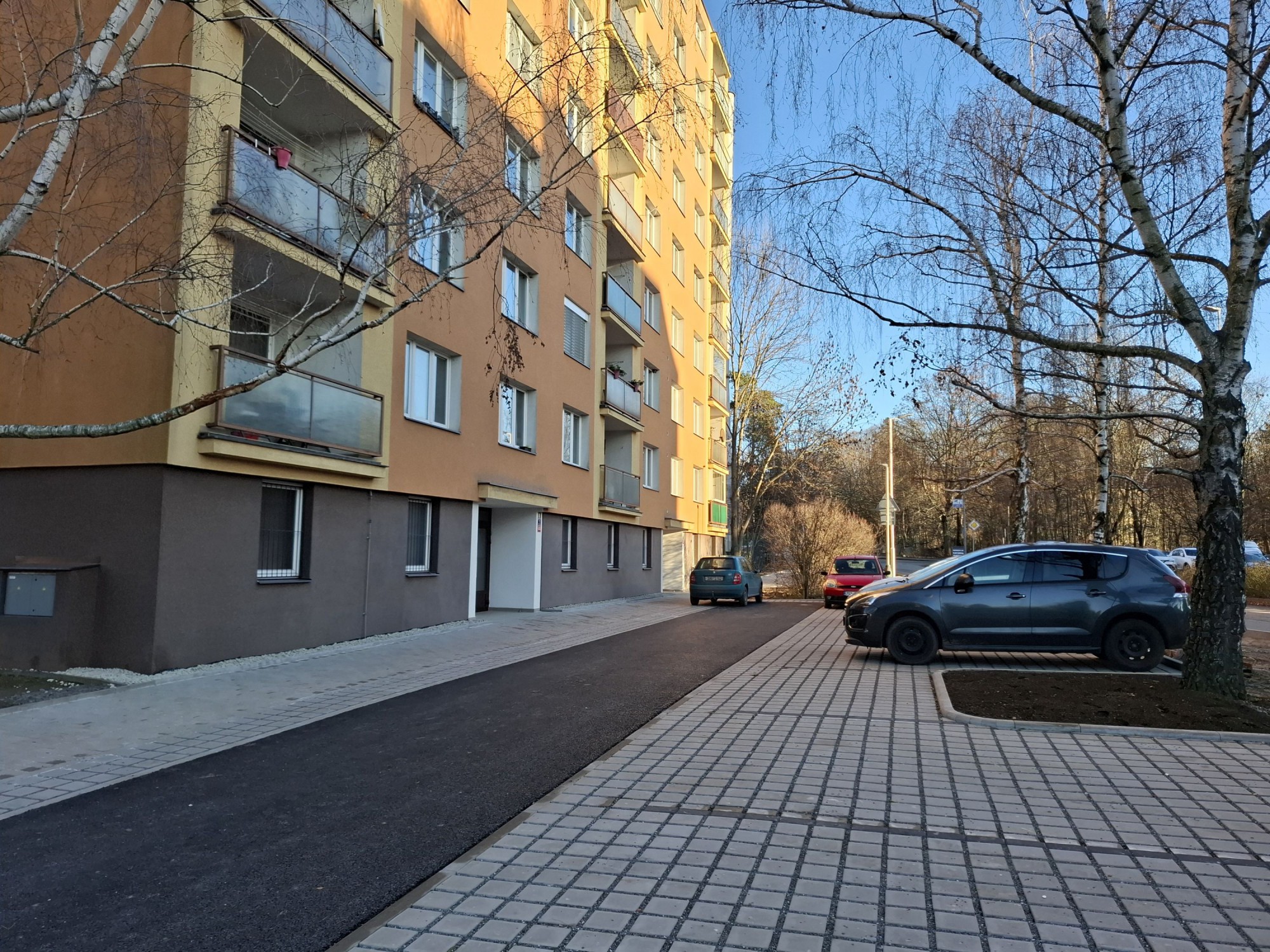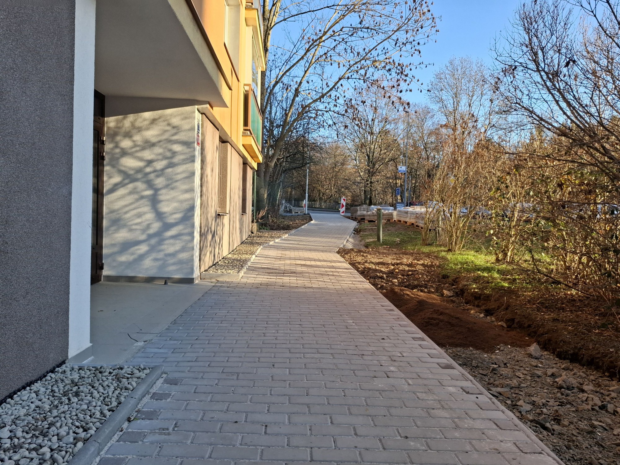 Z parkoviště nyní vede nová cesta ze zámkové dlažby ke kotelně a k přechodovému místu směrem k Olivově ulici, upravené je i okolní nároží. Obměny se dočkaly také lampy veřejného osvětlení. Součástí úprav budou také dvě mlatové cesty propojující se v zeleni za domem. Připravené jsou také plochy pro výsev trávy. Přes zimu budou na vybraná místa doplněny lavičky a odpadkové koše, do zatáček podél komunikace pak instalujeme ohebné sloupky pro zajištění vjezdu vozů IZS. U kotelny je položen nový asfalt, ale další plánované stavební práce byly dočasně pozastaveny z důvodu zjištění neidentifikovaných podzemních sítí.