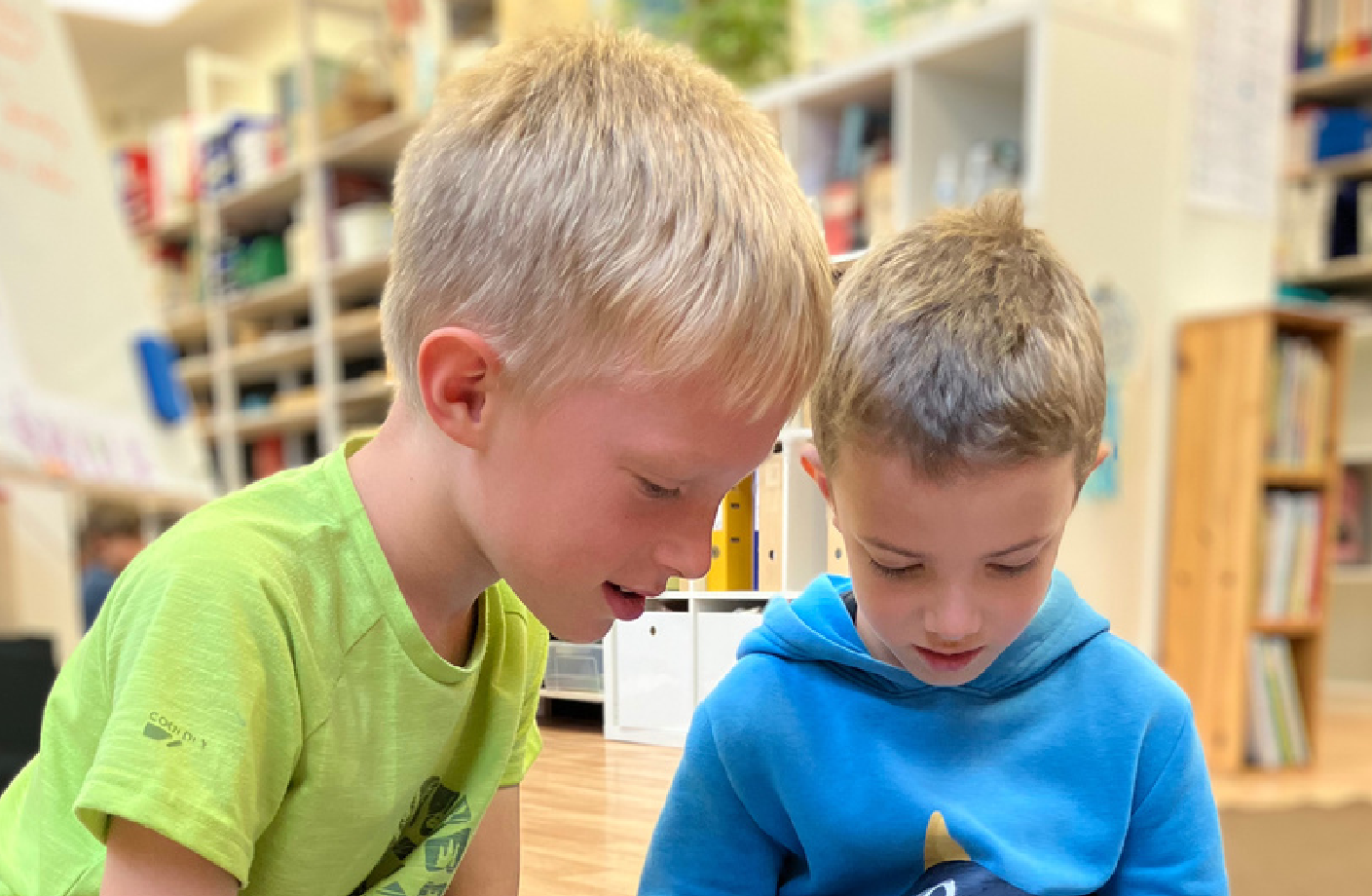 - Věkově smíšené skupiny – mladší se učí od starších, starší jsou vzorem. V jedné třídě tak můžete vidět prvňáka, který se učí číst, vedle druháka, který mu pomáhá, a třeťáka, který už samostatně pracuje na náročnějším úkolu. Děti se přirozeně učí spolupráci, trpělivosti i respektu.