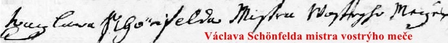 Osoba prvního říčanského kata po třicetileté válce byla poprvé zaznamenána v soudních manuálech z roku 1694 v souvislosti s pronájmem kusu obecní zahrady. Odtud je známo, že prvním zdejším mistrem ostrého meče byl Václav Schönfeld (zapisován je rovněž jako Šymfeld, Šimfeld, Šynfeldt, Šinfeldt, Šemfeld, Šenfeld, …). V soudních manuálech je zmiňováno také porovnání mezi Václavem Schönfeldem a sousedem Karlem Procházkou, kteří se dopustili (a jejich manželky) r. 1704 vzájemného zhanění. Mnohem víc lze ale vyčíst v matričních knihách. První Václavovo dítě narozené v Říčanech byla r. 1695 dcera Anna. Celkem tu má Václav v rozmezí let 1695–1719 deset dětí, z toho první dvě s manželkou Justinou, která zemřela v roce 1702. V zápisech o narození těchto dvou dětí je Václav uváděn jako pohodný v Říčanech. Dalších osm dětí měl Václav se svou druhou ženou, kterou byla Kateřina, dcera Jana Zelingera z Brandýsa nad Labem (tady už je uváděn jako mistr ostrého meče).
