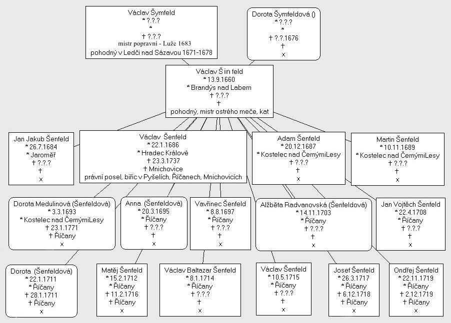 Neobjasněnou záhadou je, kde říčanský kat a jeho třetí žena zemřeli. Když se tedy zatím nedaří dohledat, kam Václav Šenfeld odešel, pokusíme se nastínit, odkud do Říčan přišel. Jeho příchod má zřejmě vazbu na Karla Zelingera, kterému byl Václav Šenfeld r. 1693 jako svědek na svatbě v Poděbradech. Ten se ujal (ačkoliv byl ještě nezletilý a měl svého poručníka) tří pohodnic, které zdědil po matce a otčímovi. Kromě pohodnice staroměstské jim patřila také pohodnice černokostelecká a pohodnice v Říčanech. A právě Kostelec nad Černými Lesy byl předchozím působištěm Václava Šenfelda. S první ženou Justinou se mu tu narodily tři děti. U prvních dvou (nar. r. 1687 a 1689) je uváděn jako pohodný, v zápisu o narození třetího dítěte r. 1693 je uveden jako mistr ostrého meče. Do Kostelce nad Černými Lesy přišel Václav zřejmě z Hradce Králové, kde se r. 1683 poprvé oženil s Justinou, dcerou zdejšího právního posla Václava Pazourka. V zápisu o narození jejich syna Václava r. 1686 je uváděn jako právní posel. Prvorozený syn Jan Jakub se ale Václavu Šenfeldovi a jeho ženě Justině narodil v Jaroměři, kde tou dobou působil jako právní posel Jarolím Šenfeld, nejspíš Václavův bratr. V záznamu o svatbě Václava je jako jeho otec uveden Václav, popravní mistr z Luže. Vzhledem k tomu, že byly nalezeny z dřívějších let záznamy o narození dětí pohodnému v Ledči nad Sázavou Václavu Šenfeldovi a jeho ženě Dorotě, lze usuzovat, že rodiče prvního říčanského kata byli titíž. To by potvrzovalo už dříve nalezený zápis z Brandýsa nad Labem o narození syna Václava otci Václavu Schinfeldovi a matce Dorotě r. 1660.