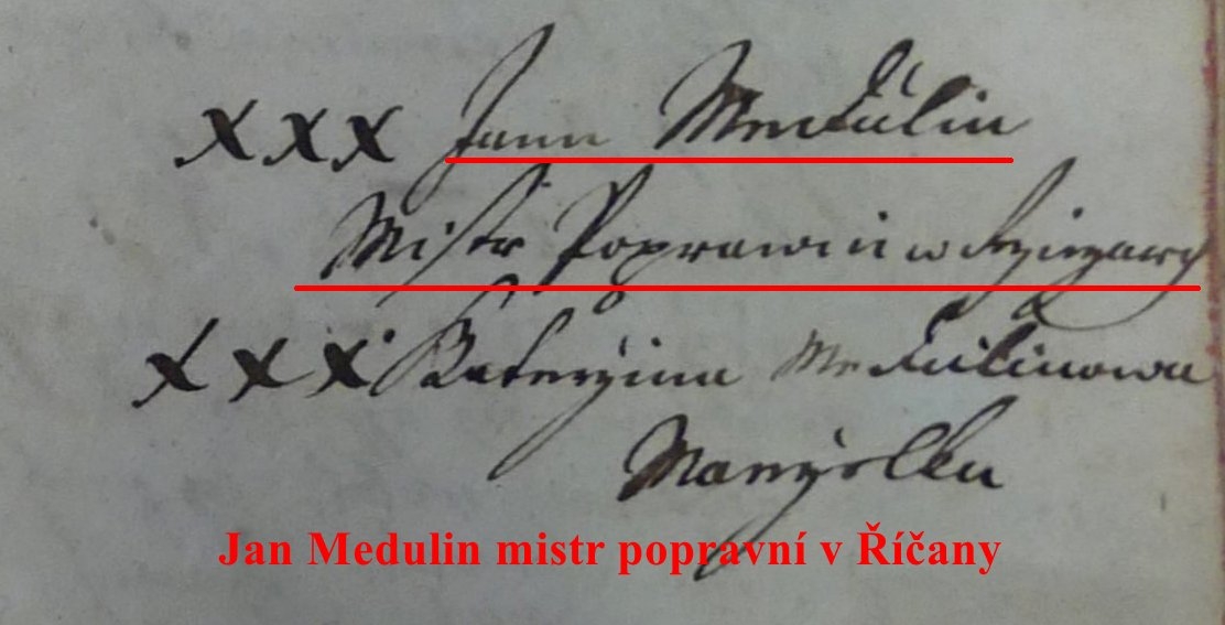 Gustav Trnka píše ve své knize Město Říčany v minulosti i přítomnosti, že posledním mistrem ostrého meče v Říčanech byl Jan Medulín (dříve pohodný ve Škvorci), který provozoval toto řemeslo až do své smrti r. 1772, kdy bylo hrdelní právo v Říčanech zrušeno.
