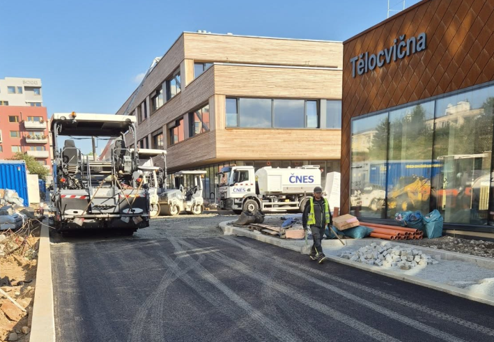 → Před novou školou na Komenského náměstí už je téměř hotová nová silnice.