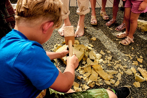 Kameník pustil k práci každého. Děti zvládly držet těžké kladivo jen oběma rukama.