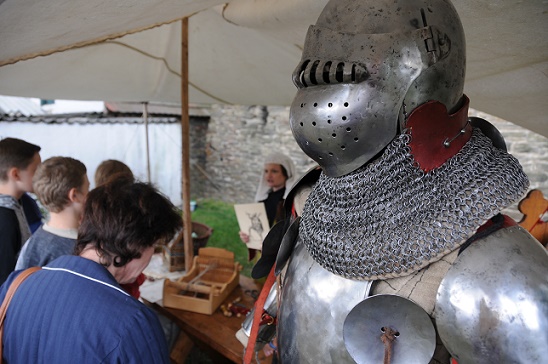 Na hradě zbrojnoš učil střílet z házecího praku. Mohli jste si vyzkoušet i jeho drátěnou kuklu.