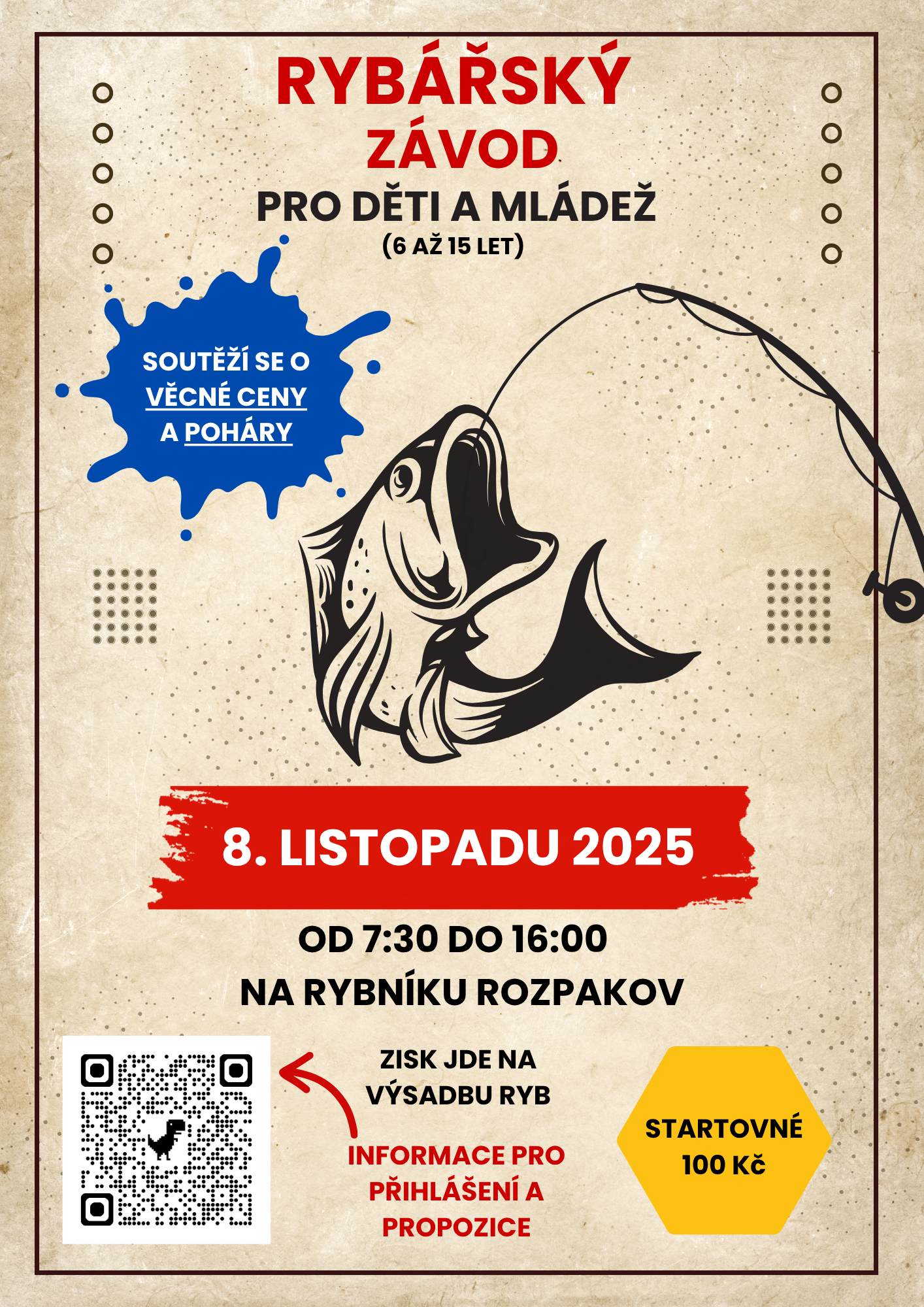 Závod je určen pro děti a mládež od 6 do 15 let (včetně). Zúčastnit se mohou začátečníci i pokročilí rybáři. Akce se bude konat v sobotu 8. 11. 2025 od 7.30 cca do 16.00 hodin na rybníce Rozpakov.