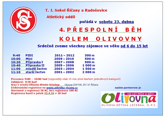Další akcí říčanské atletiky, na kterou vás tímto srdečně zveme, bude 4. ročník přespolního běhu kolem Olivovny 23. 4. 2016.