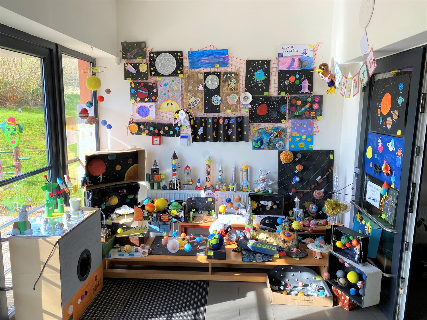 Již v minulých letech jsme uspořádali několik výtvarných soutěží pro děti a jejich rodiče. I teď na jaře jsme jednu vyhlásili, a to na téma Vesmír. Ačkoli se to zpočátku nezdálo, byli jsme překvapeni obrovskou spoustou výtvorů vyrobených různými technikami a nestačili jsme obdivovat nápady a kreativitu všech. Vestibul školy nám tak ozdobily 3D výrobky i obrázky, představující sluneční soustavu, planety, raketoplány, kosmonauty, družice, meteoradary a jiné. Některé z výrobků byly i osvíceny. Všechny děti, které přinesly výrobek, jsme odměnili diplomem a drobnými dárky. Mnohokrát děkujeme všem, kteří se soutěže zúčastnili.