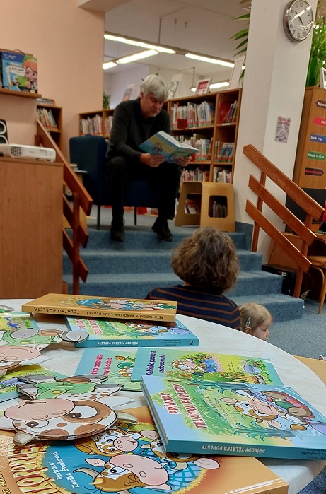 Vtipné příhody telátka Poplety, dlouhé tak akorát, vznikly původně pro malé dcery Petra Hudského. Když dcery vyrostly, společně je sepsali a vznikly knihy, které dnes baví děti i rodiče. Autorské čtení mělo skvělou atmosféru – příjemný hlas pana Hudského dokázal posluchače zaujmout na dlouhou dobu a rozesmál nejen děti, ale i rodiče a knihovnice. Na závěr nechyběla ani malá autogramiáda.