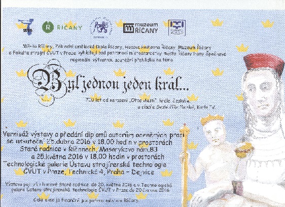 Město Říčany, Základní umělecká škola Říčany, Husova knihovna Říčany, Muzeum Říčany a Fakulta strojní ČVUT v Praze vyhlašují pod patronací místostarostky města Říčany Hany Špačkové regionální výtvarnou soutěžní přehlídku na téma "Byl jednou jeden král"