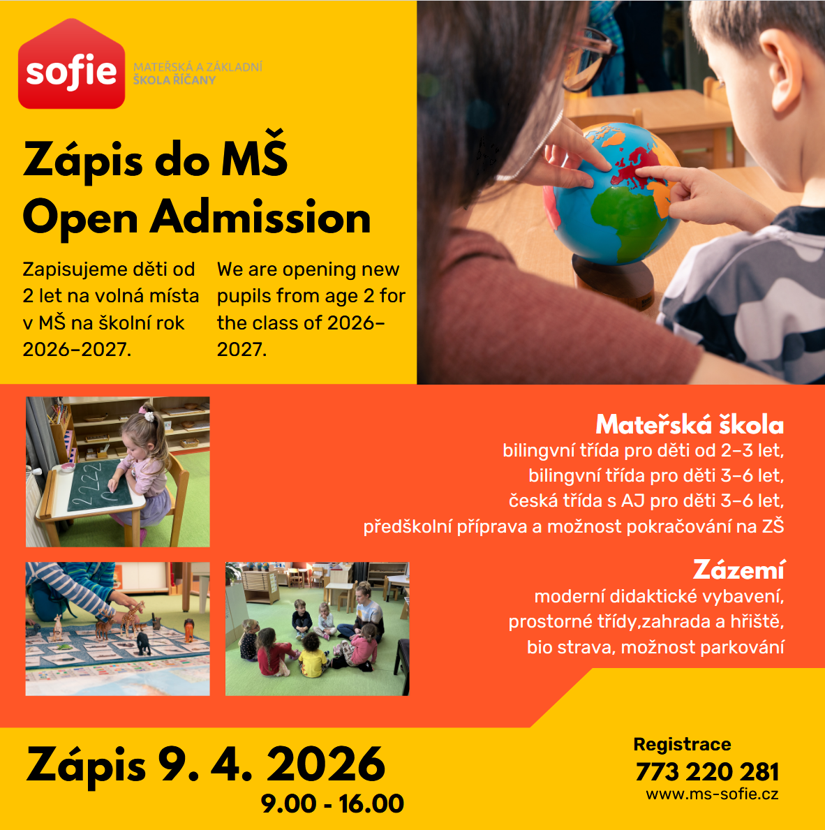 Zápis 9. dubna je příležitostí poznat prostředí školy osobně a zjistit, zda je právě MŠ Sofie místem, kde může vaše dítě vyrůstat a rozvíjet svůj potenciál naplno. Na prohlídku školy však můžete přijít i mimo oficiální termín zápisu, den otevřených dveří máme každý den po domluvě.