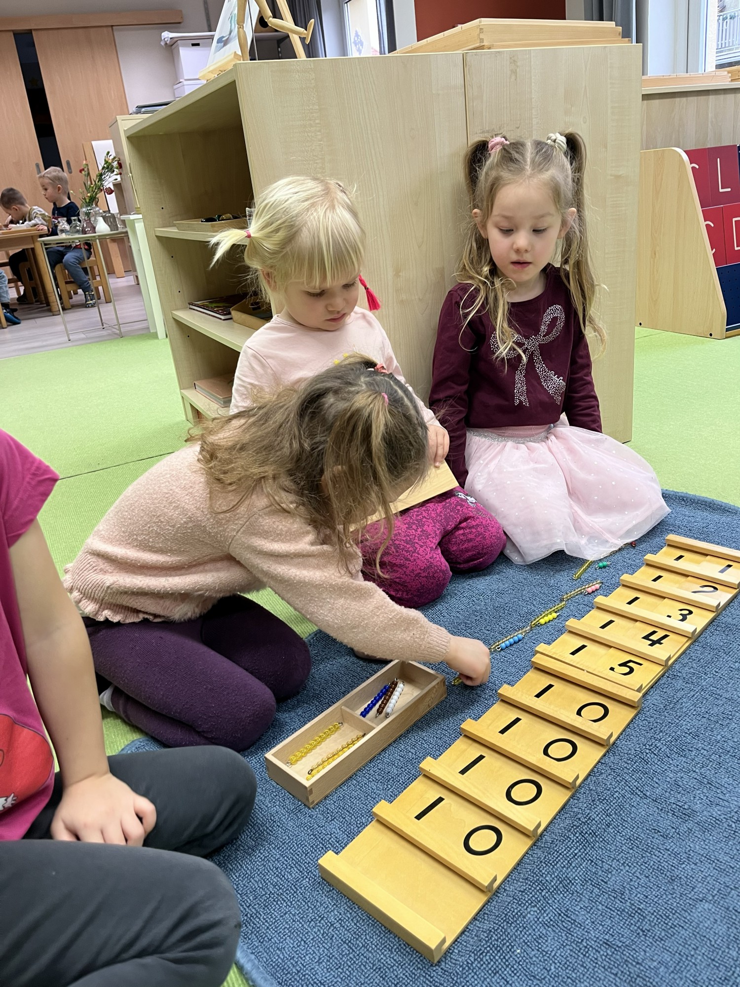 Třídy pro děti ve věku 3–6 let jsou vybaveny promyšlenými didaktickými materiály, které umožňují dětem objevovat svět skrze vlastní zkušenost. Vzdělávání zde stojí na hlubokém porozumění, nikoli na memorování. Děti pracují s konkrétními pomůckami, díky nimž dokážou pochopit matematické zákonitosti, které byly v minulosti vyhrazeny až pro základní školu. Přirozeně si osvojují princip přechodu přes desítku, pracují s vícemístnými čísly a budují si pevné základy logického myšlení. Nejde o urychlování vývoje, ale o respekt k přirozené zvídavosti: Když je dítě připravené, prostředí mu nabídne možnost jít dál. Podobně pracujeme v oblasti jazyka, a v jedné ze tříd rovněž bilingvně.