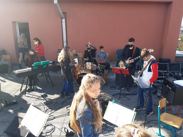 Doba není dobrá… Vše ukazuje na to, že tento školní rok bude pro všechny velmi složitý a bylo nám jasné, že si v něm asi moc nezahrajeme. Vzhledem k tomu, že máme muziku rádi, chtěli jsme, aby nám z koncertů vyšlo alespoň něco. Hned v září jsme se domluvili, že se budeme snažit při zkouškách dodržet co nejvíce hygienických zásad, abychom případně dohráli co nejpozději. Tzn. hned po vstupu do hudebny jsme si vydesinfikovali ruce, zkoušeli jsme všichni v rouškách, dodržovali jsme rozestupy… Navíc nám bylo jasné, že pokud budeme chtít někde hrát, musíme mít skladby nacvičené co nejrychleji. Takže začal „kolotoč“. Zkoušeli jsme před školou, po škole, o přestávkách, zkrátka, kdy se dalo. A děti z kapely byly naprosto úžasné! Jakákoliv pravidla bez reptání přijaly, chodily skvěle připravené a zkoušky probíhaly v obvyklé pohodě.