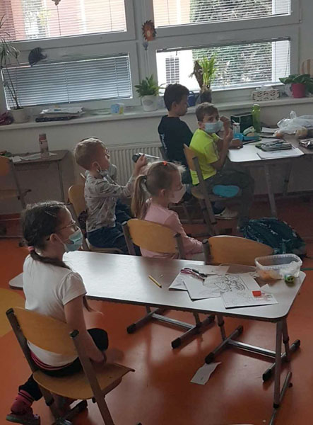 Na naší škole se provoz zcela nezastavil. Každé ráno přichází 15 dětí z různých škol, jejichž rodiče jsou zapojeni v integrovaném záchranném systému. Potkávají se zde děti různého věku od 4 do 10 let. Je u nás stále veselo. S dětmi jsou stabilně dvě paní vychovatelky a jeden učitel, dopoledne se společně učí nebo mají on-line připojení se ke své škole (Microsoft Teams, Google Classroom, Skype), odpoledne si hrají, dle možností jsou alespoň na chvíli v přírodě.