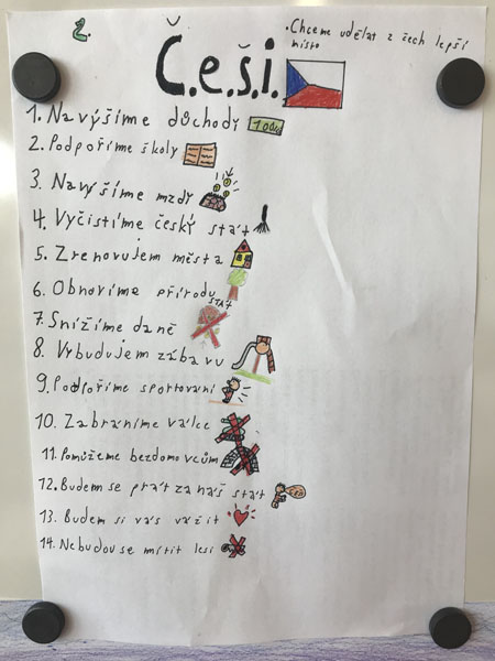 Protože škola má nejen vzdělávat a vychovávat, ale také vést děti k občanské odpovědnosti, čekala naše čtvrťáky v den voleb do Parlamentu ČR zajímavá výzva. Po úvodní diskuzi o významu a průběhu demokratických voleb si měli založit vlastní strany, vymyslet volební programy, veřejně je prezentovat a nakonec si sami zvolit vítěze našich třídních voleb. Musím s nadšením konstatovat, že děti se náročných úkolů zhostily velmi zodpovědně, s velkým elánem a naštěstí i vtipem. Volili jsme ze čtyř nově ustanovených stran: Č.E.Š.I., Divoký tygři (to není chyba ve skloňování, ale volba samotných žáků, název má evokovat jejich odhodlání), Štít obrany a Soumrak. Členové všech stran se se ctí a překvapivou nápaditostí vypořádali se všemi úkoly a jen pro vaši informaci - volby vyhrály první dvě jmenované strany. Bylo úžasné sledovat, jak naše děti dokáží přemýšlet o světě kolem sebe, jak nezapomínají ve svých programech ani na potřebné a ohrožené, jak kultivovaně diskutují a obhajují si své názory, a jak si dokáží ve vší slušnosti a uctivosti sdělit, proč nesouhlasí s názorem protistrany. Vedle prezentačních dovedností, formulace myšlenek, vyjádření vlastního názoru apod. se děti zároveň procvičily i v kritickém myšlení, když dokázaly odhalit plané sliby a dokonce hrozby strany Soumrak, která svůj volební program záměrně postavila na populistických výzvách, jako např. návrh známkování samými jedničkami pro všechny žáky. Věřte tomu nebo ne, samy děti zamítly lákavý slib a dokázaly si zdůvodnit jeho nesmyslnost. Jako třídní učitelka ve 4. ročníku jsem se dneškem přestala obávat o naši budoucnost - jsme v dobrých rukách!