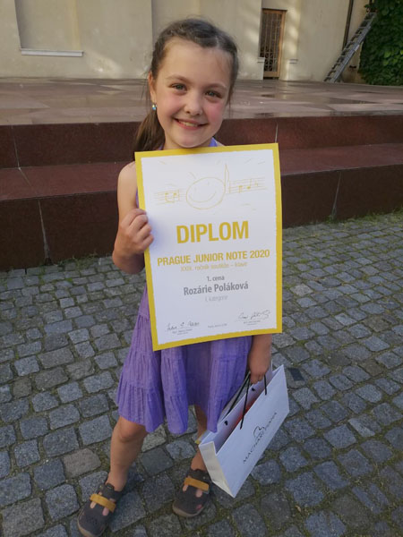 Dalším skvělým úspěchem překvapila Rozálie Poláková, která získala 1. místo v klavírní soutěži Praque Junior Note a zahrála si i na koncertě vítězů. Rozálka studuje klavírní hru ve třídě pana uč. Michala Rezka.