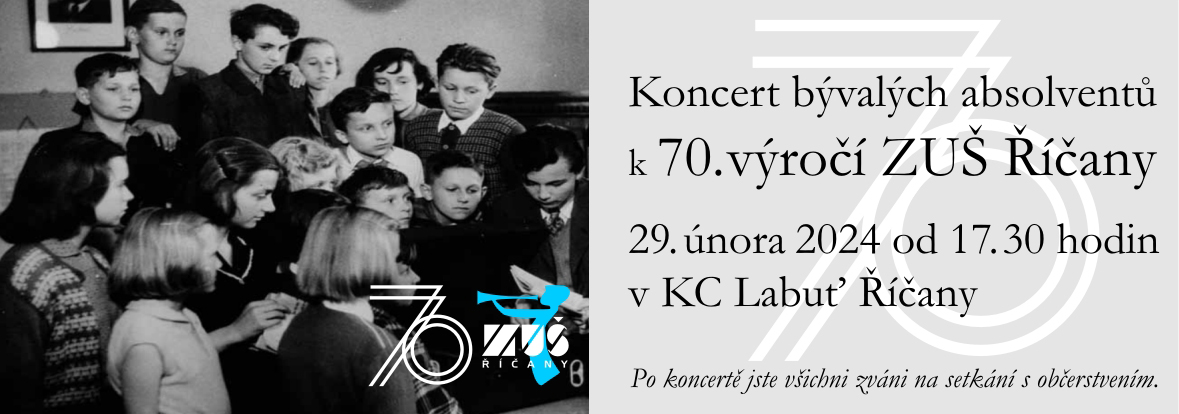 jak asi už víte, základní umělecká škola v Říčanech oslavuje v tomto školním roce 70. výročí svého založení. Za těch sedm desítek let prošly uměleckým vzděláváním v Říčanech, tehdy ještě pod křídly Státní hudební školy nebo posléze Lidové školy umění, desítky absolventů. Není možné již spočítat, kolik absolventů to doopravdy bylo ,a právě proto bychom rádi uspořádali společné setkání vás všech, kteří si ve čtvrtek 29. února 2024 v 17.30 uděláte čas a přijdete na slavnostní koncert bývalých absolventů do KC Labuť. Ti, kteří ještě svůj nástroj neopustili, mohou si s námi zahrát v orchestru (party už máme připravené) nebo předvést svůj sólový výkon na pódiu. A vás, kteří již nejste umělecky aktivní, srdečně zveme na koncert. Po koncertě plánujeme malé společné posezení spojené s občerstvením a zavzpomínáním si na doby, které jsou již dávno za námi a na fotografování všech absolventů, kteří na koncert přijdou. Budeme se těšit, že přijdete v co největším počtu a že naše společné foto bude dokument pro další generace o tom, co se dělo v roce 2024.