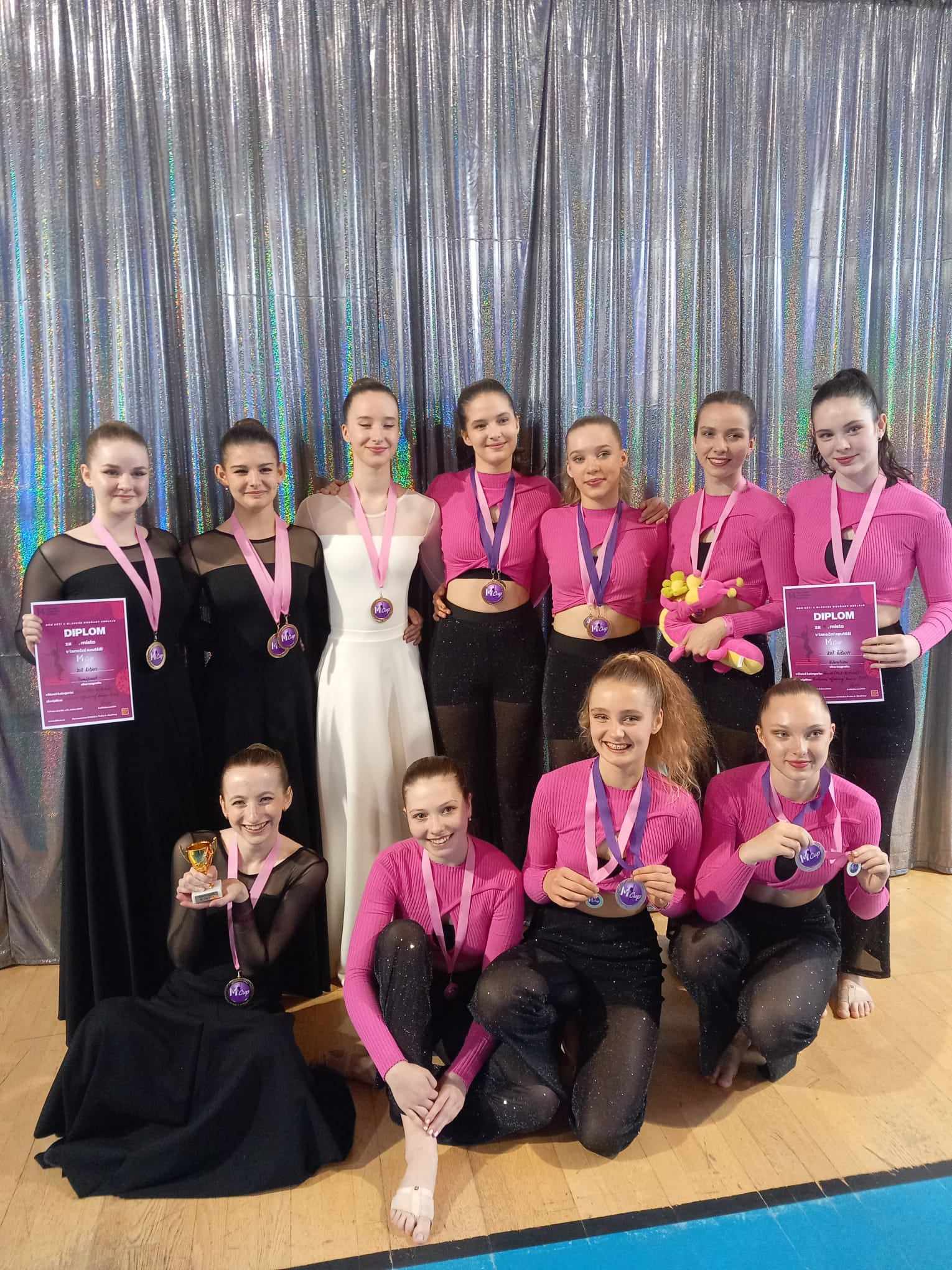 Děvčata ze třídy Ivany Sikorové a Pamely Morávkové sbírají medaile, kde se jen dá. Na fotografii 1. místa v taneční soutěži M – Cup.