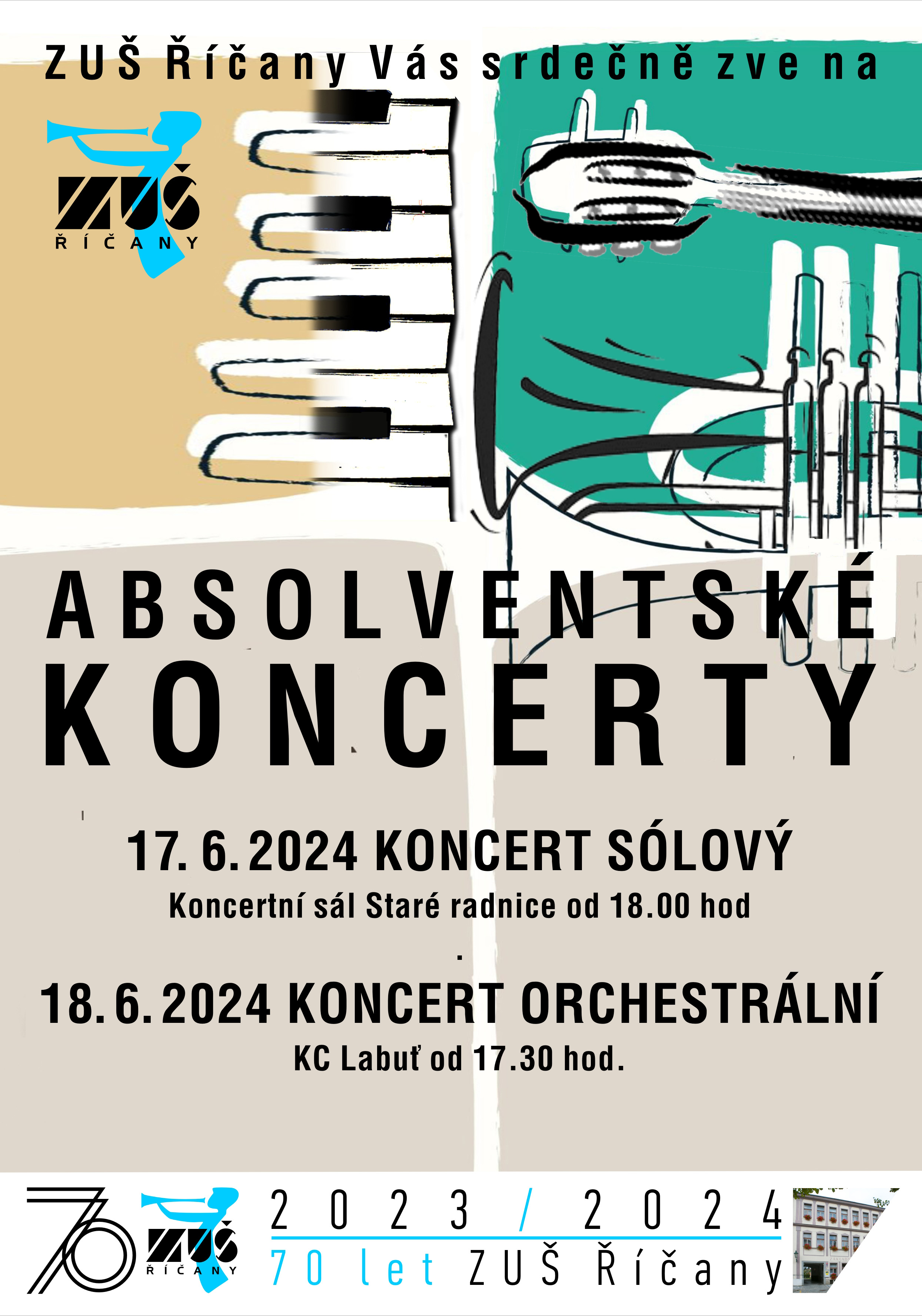 Zveme vás všechny do nového sálu Pražské konzervatoře, kde se 12. června 2024 v 17.30 uskuteční slavnostní koncert k 70. výročí založení ZUŠ Říčany. Pozadu nezůstává ani výtvarné oddělení. Pokud si uděláte výlet do Prahy, navštivte Fakultu strojní ČVUT v Praze a její Technologickou galerii, kde bude do 31. srpna zpřístupněna výstava našich výtvarníků.