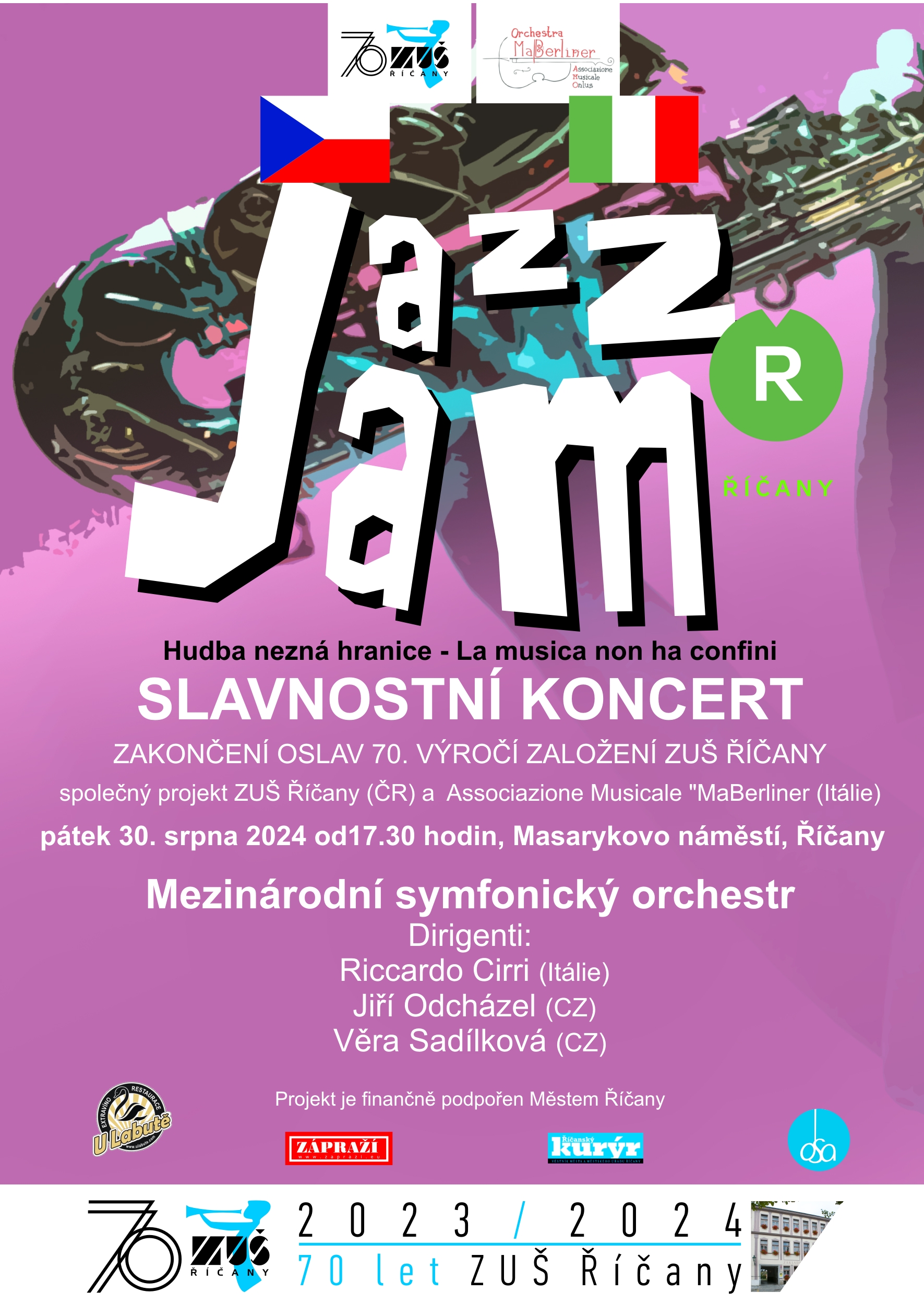 V srpnu zase na oplátku navštíví italští hudebníci naši školu. Připravujeme pro ně zajímavý program návštěvy, budou probíhat společné zkoušky a společnými koncerty ukončíme oslavy 70. výročí založení ZUŠ Říčany. Přikládáme pozvánku a těšíme se, že si našimi koncerty zpříjemníte zbývající dny prázdnin.