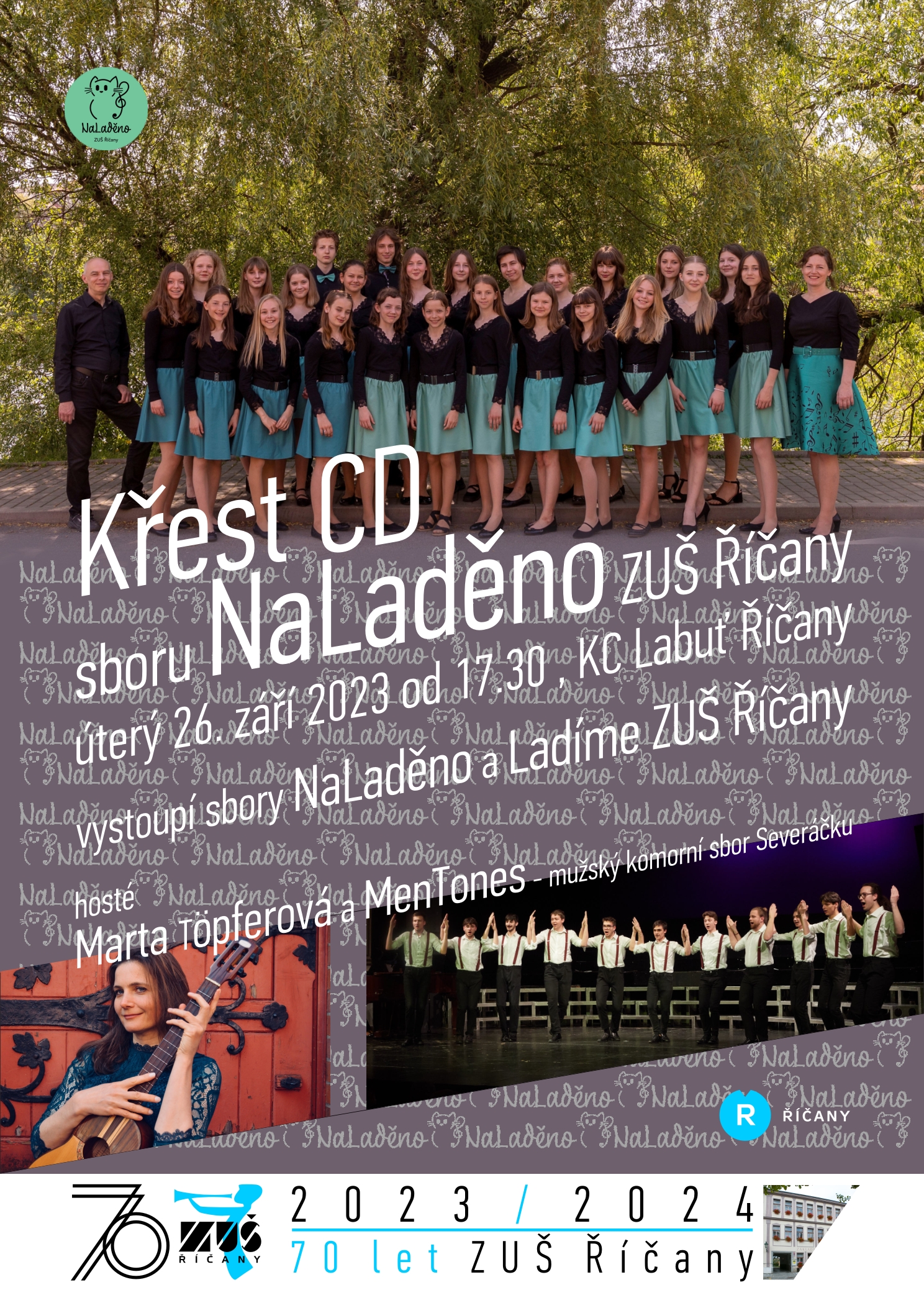 26. září 2023 v 17.30 v KC Labuť proběhne křest CD pěveckého sboru Naladěno ZUŠ Říčany. Hosté večera budou Marta Töpferová a mužský pěvecký sbor Severáčku Men Tones.
