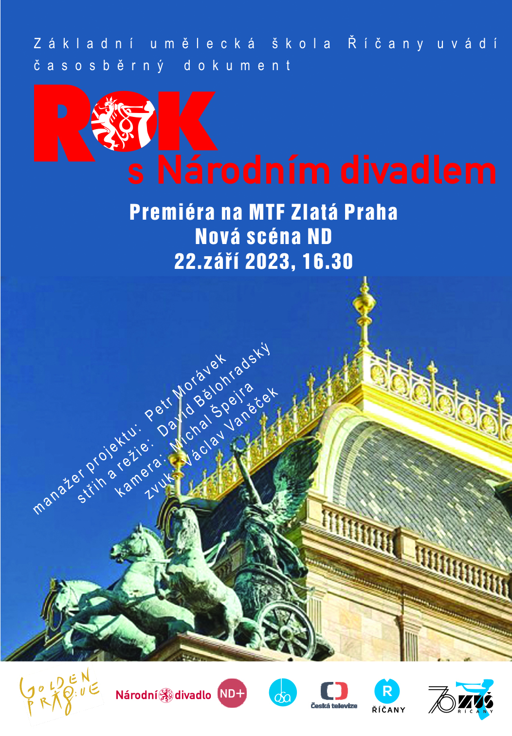 22. 2023 v 16.30 vás všechny zveme do ND na Novou scénu na Mezinárodní televizní festival Zlatá Praha. Dokument Rok s Národním divadlem byl přijat jako nesoutěžní snímek na tento významný festival a jeho premiéra se uskuteční právě tady. Byly bychom rádi, abyste při této neopakovatelné události byli všichni s námi v ND. Vstupenky si můžete zajistit buď v ZUŠ (stačí poslat e-mail), nebo přímo v rezervačním systému MTF Zlatá Praha. Tímto aktem uzavřeme tento jedinečný a neopakovatelný rok. Ovšem ve spolupráci s ND budeme dál pokračovat, ale ne v tak intenzivní míře.